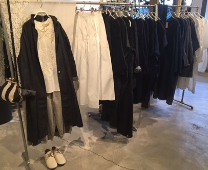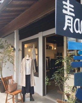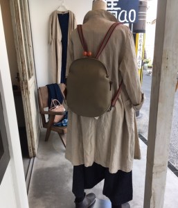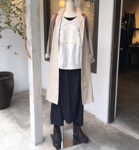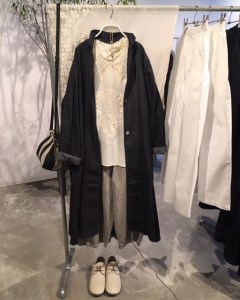 高城染工の麻の生成りのベージュコート、33,000円+税を、さらりと羽織って♫
