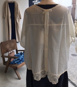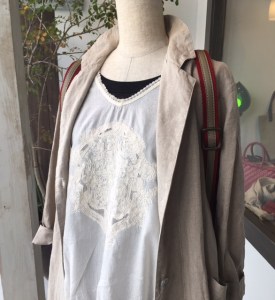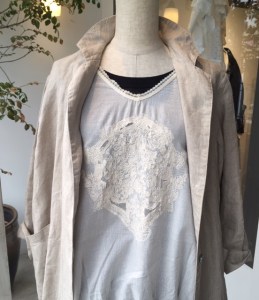 刺繍を引き立たせる為にインナーにポプリの黒の麻のタンクトップ、7,900円+税を。