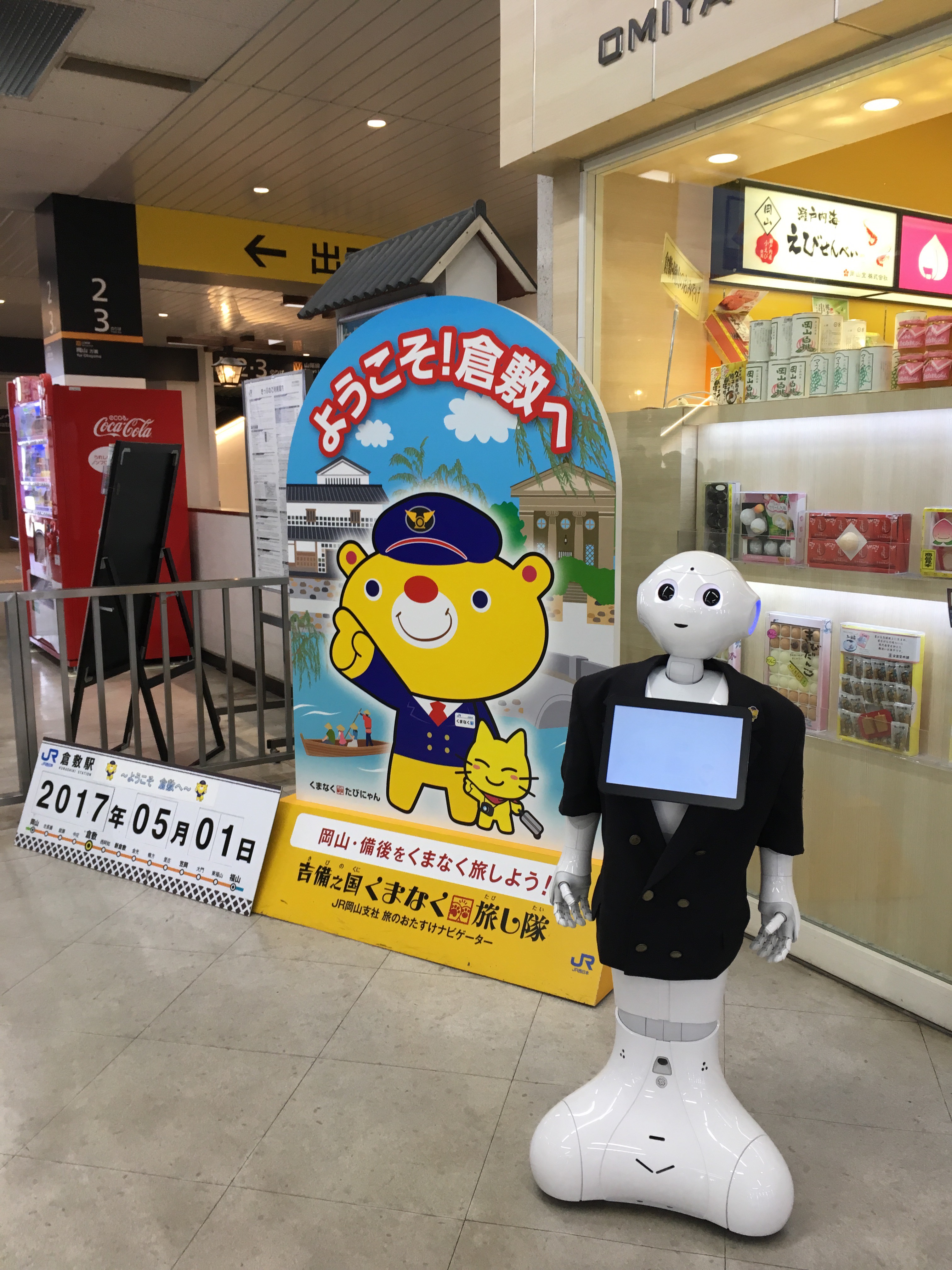 ようこそ倉敷へ🎶と倉敷駅には駅員ペッパー君がお出迎え🤗