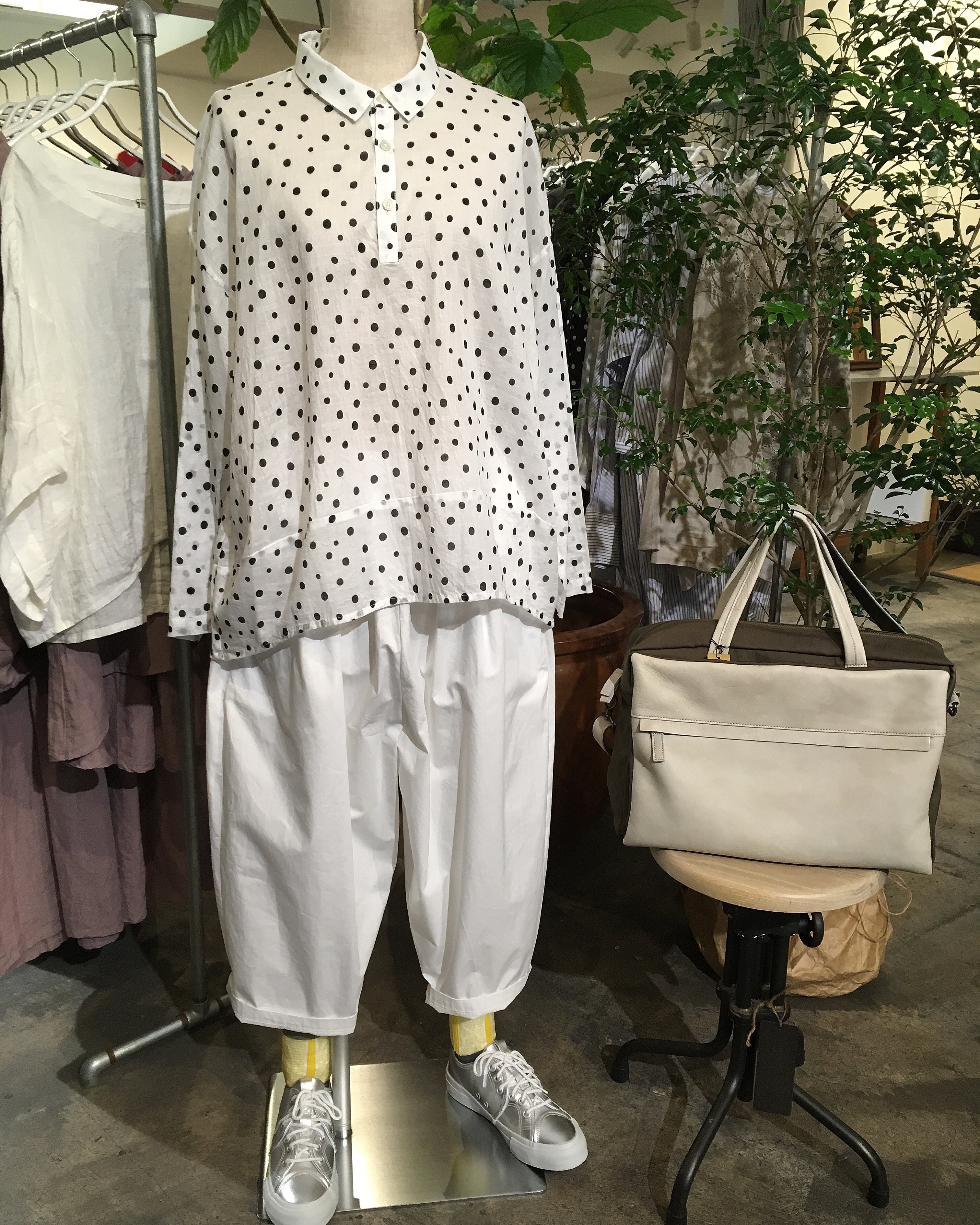 +2の水玉ブラウス 17,000円+税、デニールの白のエッグパンツ 16,000円+税
