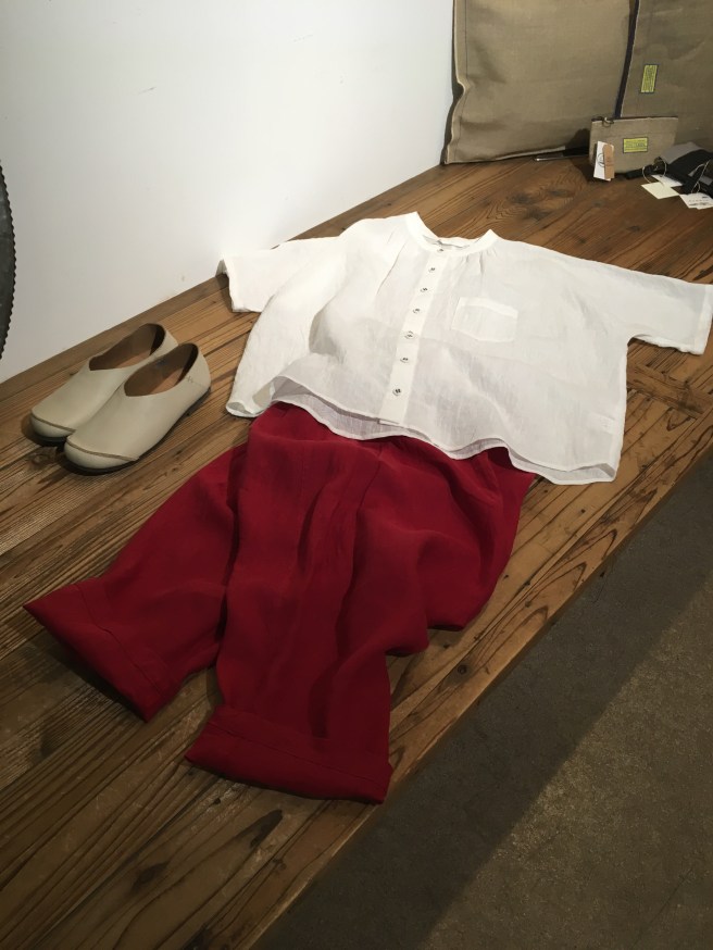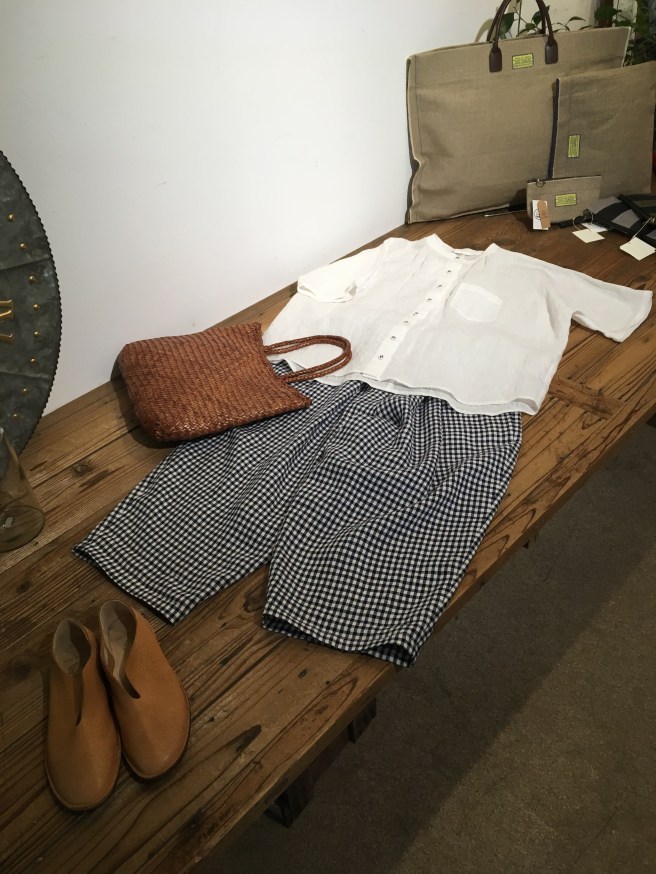 オリジナルの藍染ノースリーブと白のパンツで。