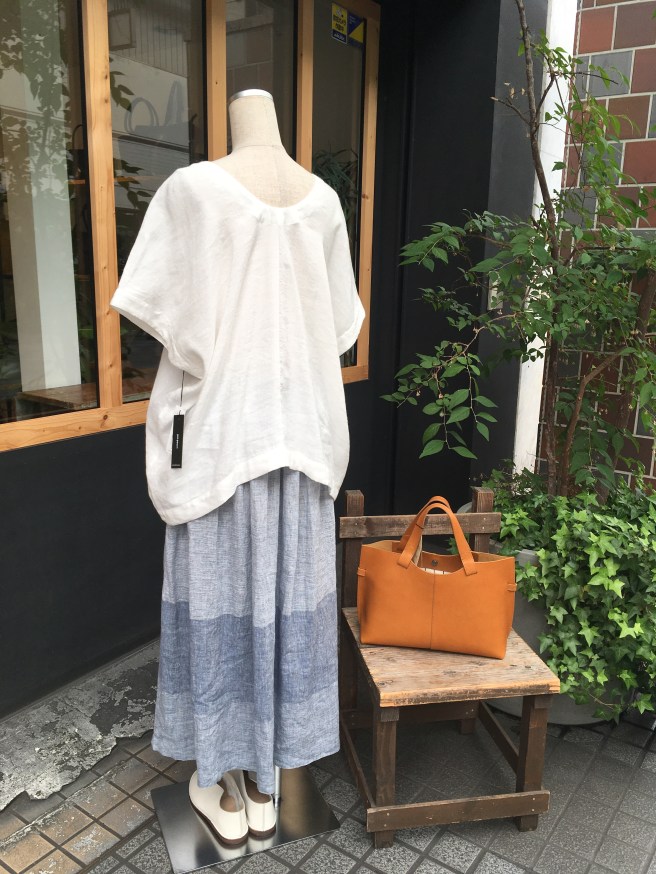 スカートはデニール、イタリアリネンをたっぷり使ったボーダー生地、27000円➡︎18900円+税