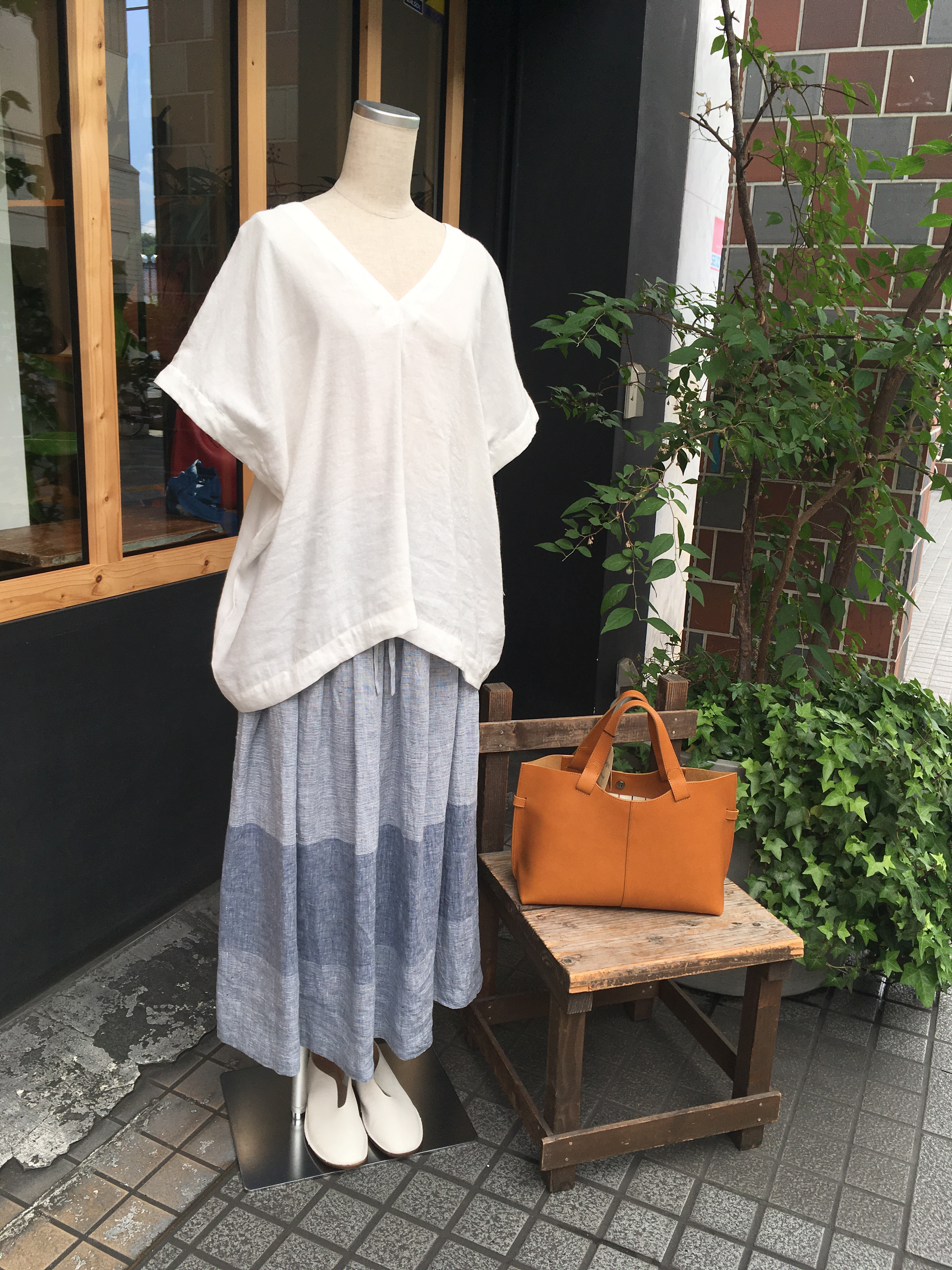スカートはデニール、イタリアリネンをたっぷり使ったボーダー生地、27000円➡︎18900円+税