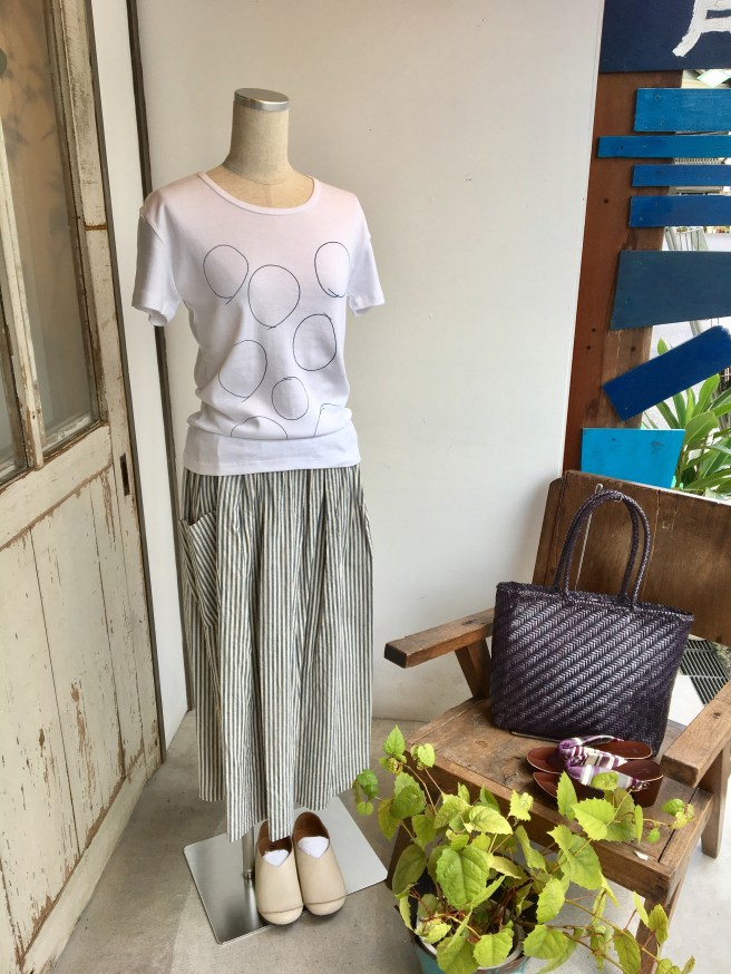 シンプルな白Tシャツに藍染の丸が書かれた可愛いTシャツに、片側だけだけポッケの付いたシマシマスカートと合わせて‼︎‼︎