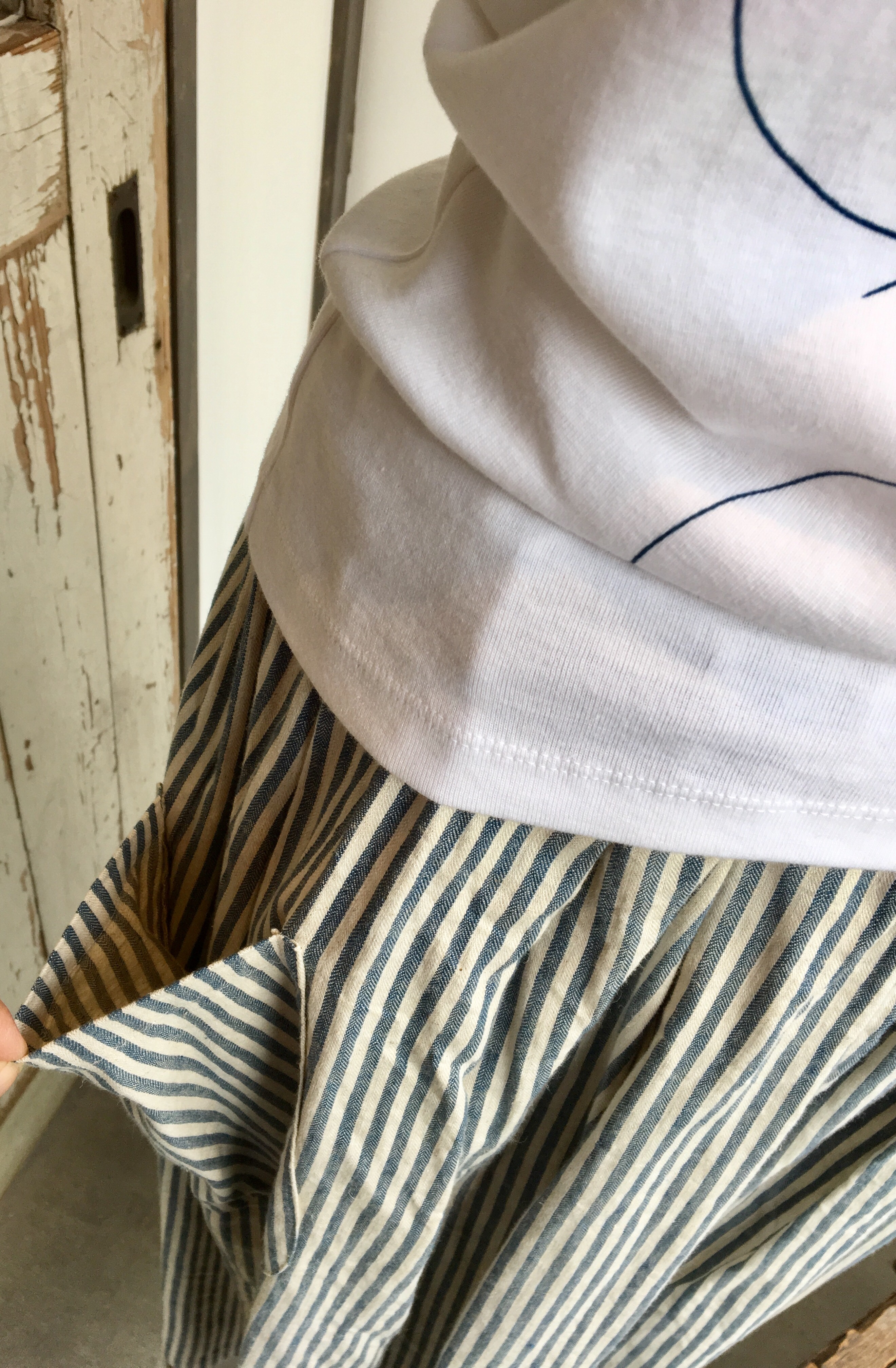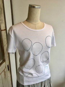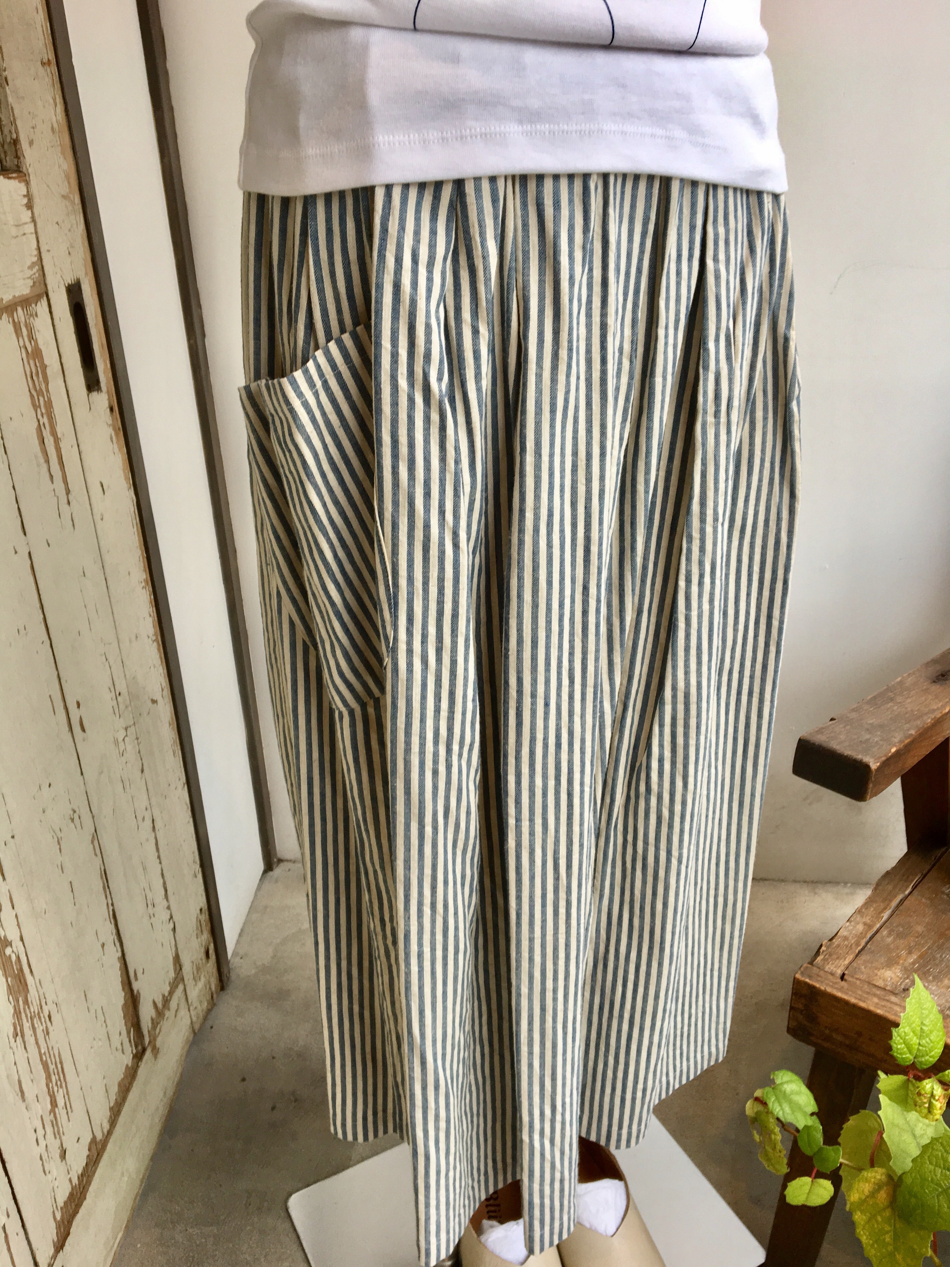 シンプルな白Tシャツに藍染の丸が書かれた可愛いTシャツに、片側だけだけポッケの付いたシマシマスカートと合わせて‼︎‼︎