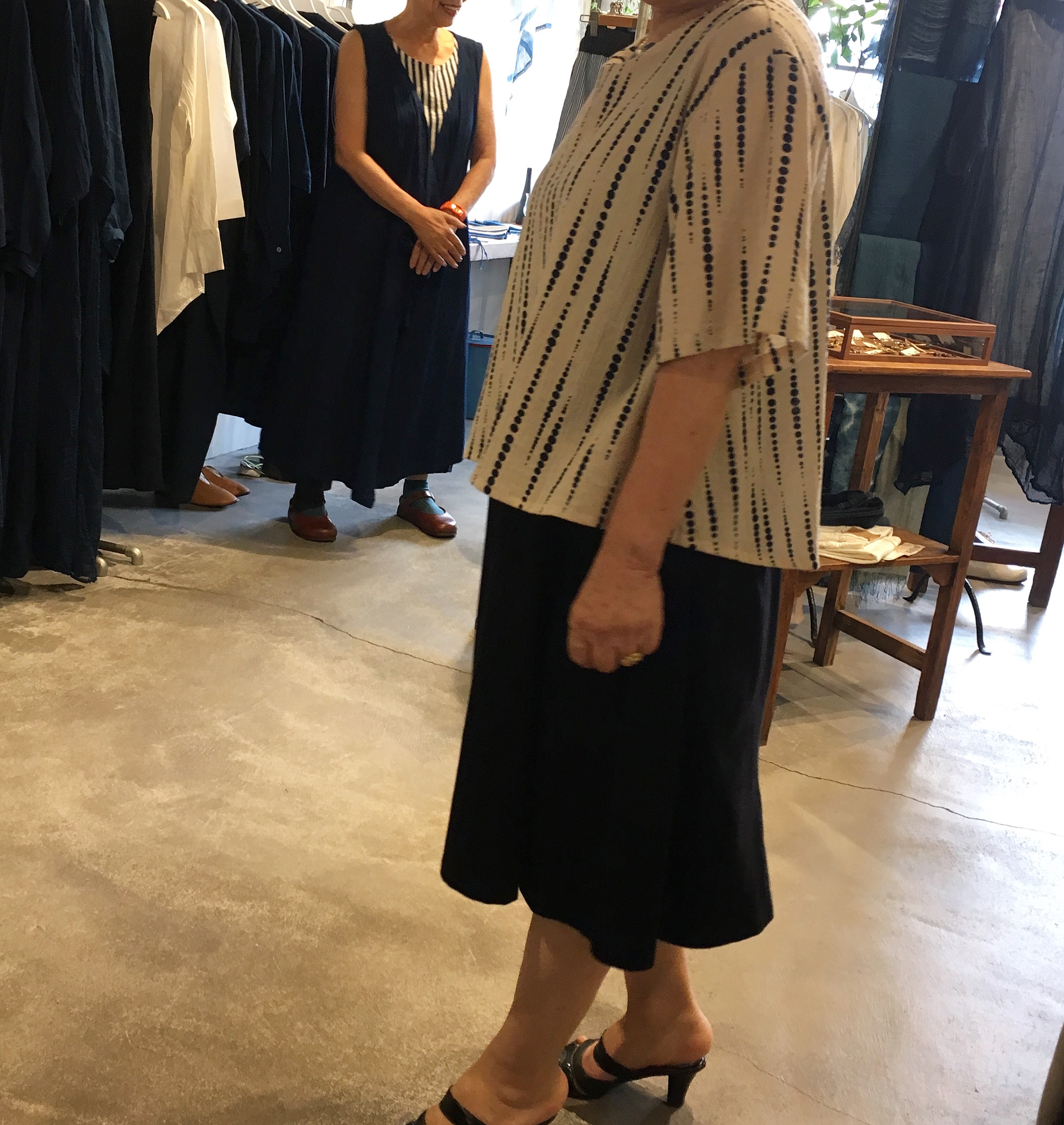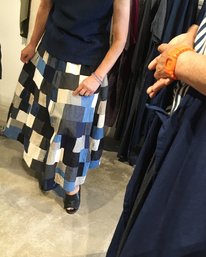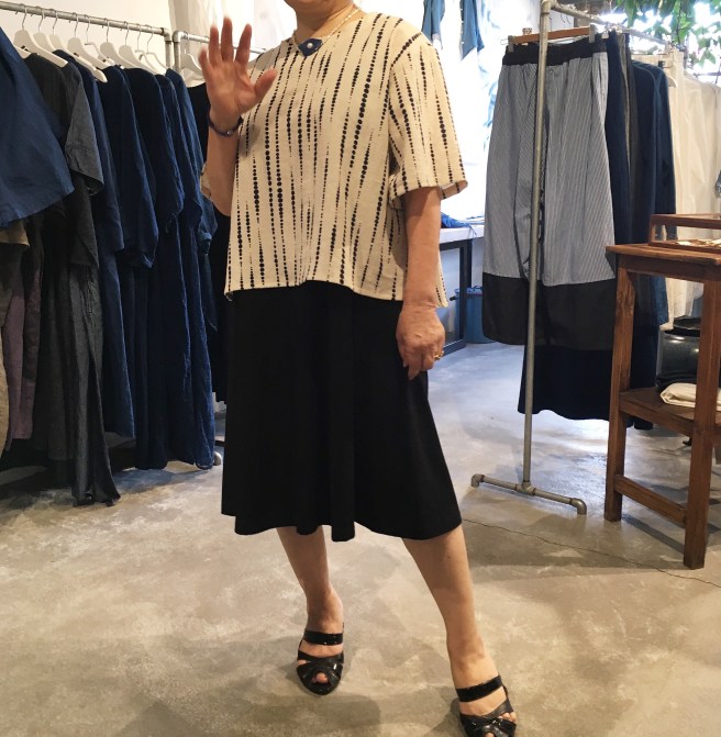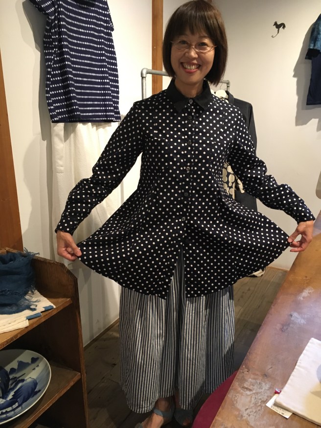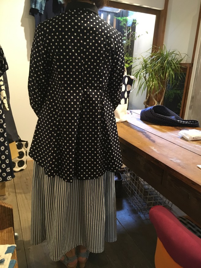 元々履いてこられた高城染工のストライプのスカートに、みどりさんのドットのシャツをコーデ❤️