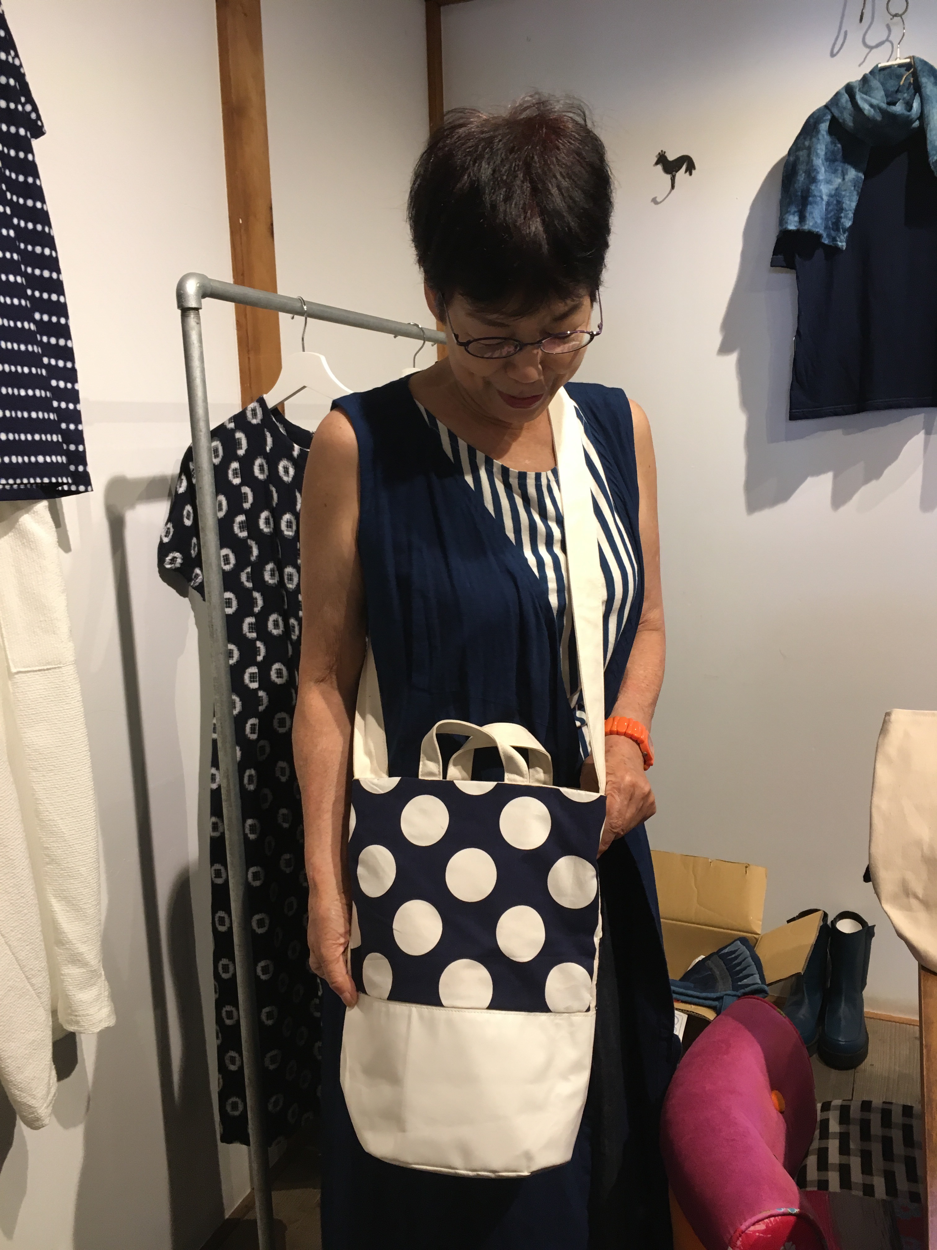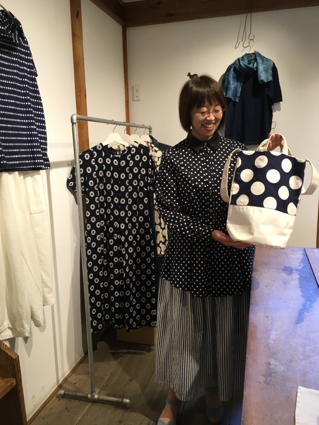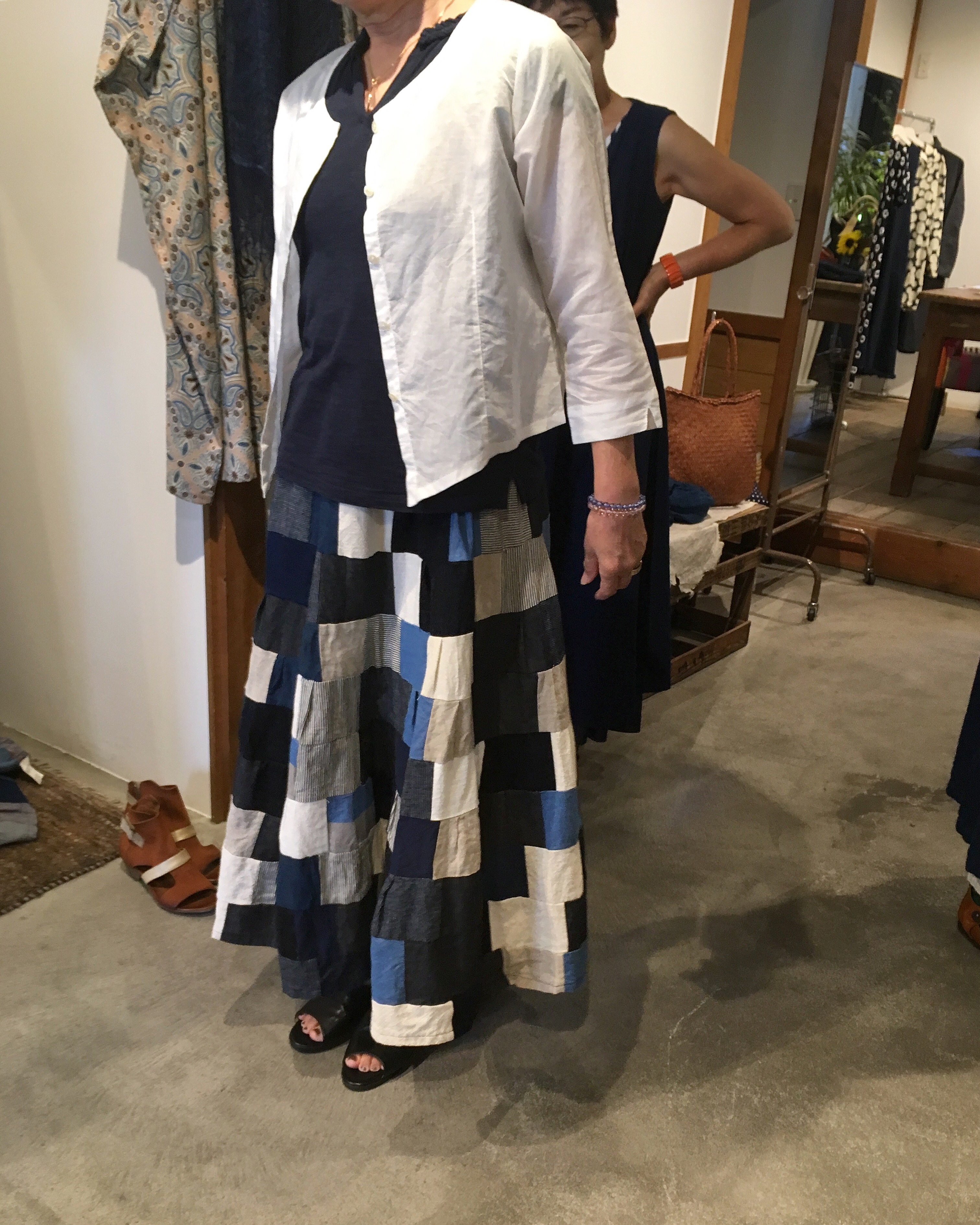 元々履いてこられた高城染工のストライプのスカートに、みどりさんのドットのシャツをコーデ❤️
