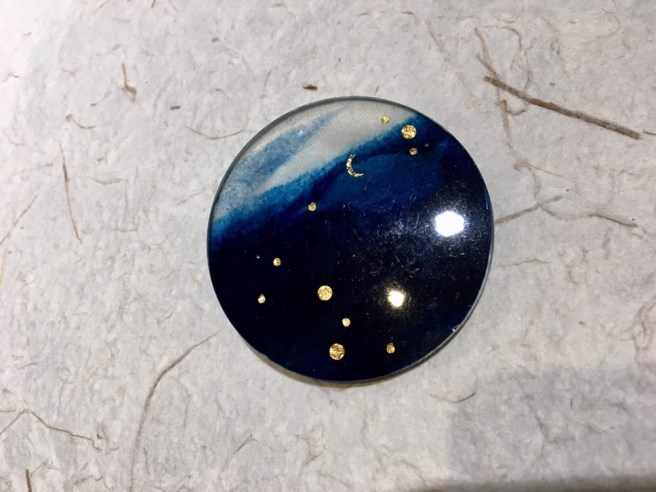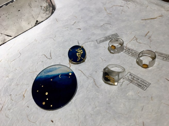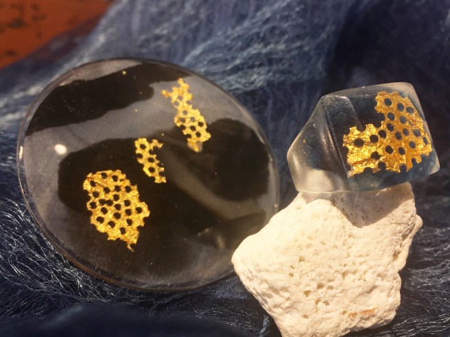 樹脂をメインに和紙、彫金素材、ガラス、天然石を組み合わせて 、すべて東京のアトリエにて手作りしてます。