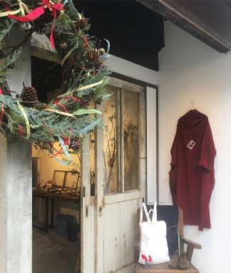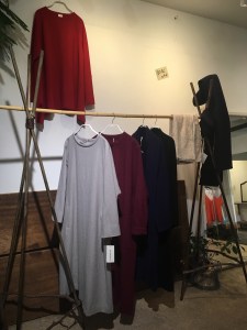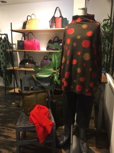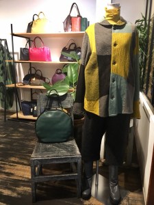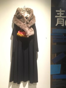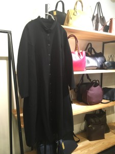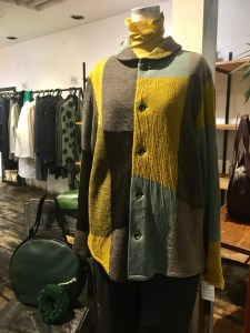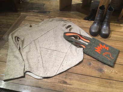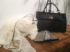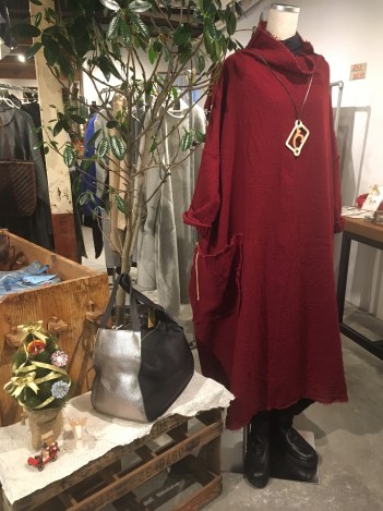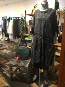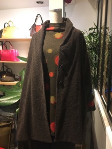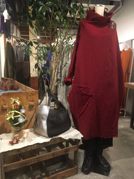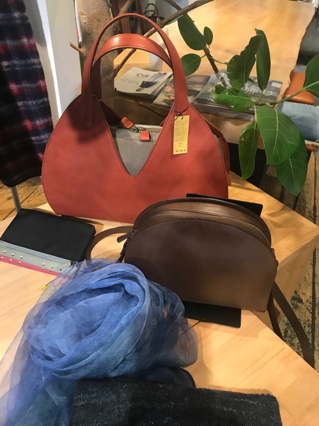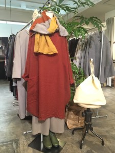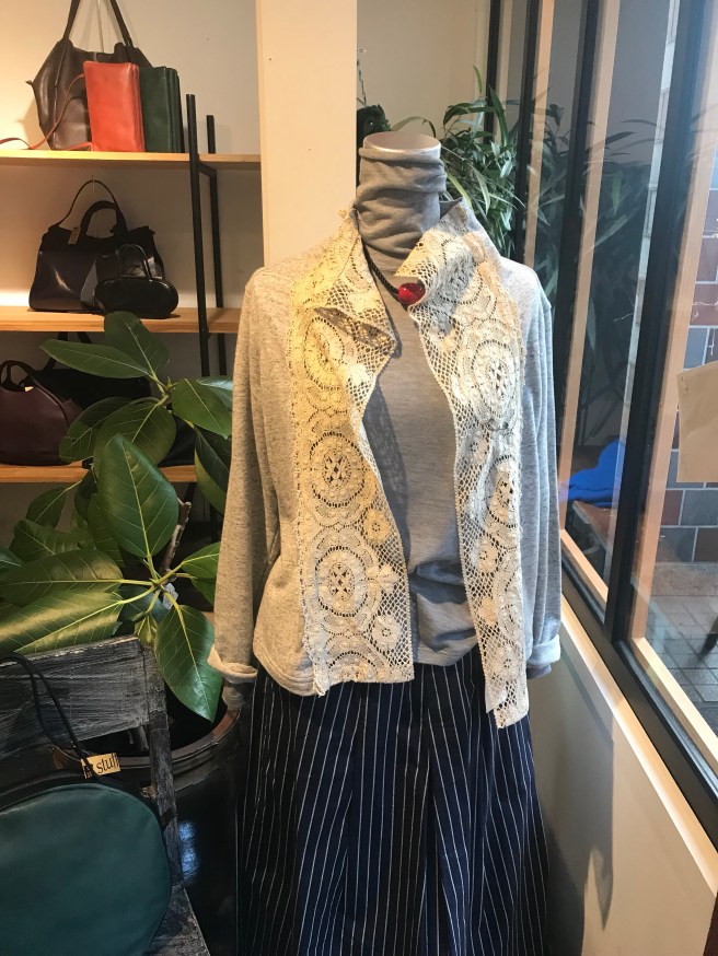 BスタッフのバッグとMIYACO羽織物。レースと綿のカーディガン。これからコート下、