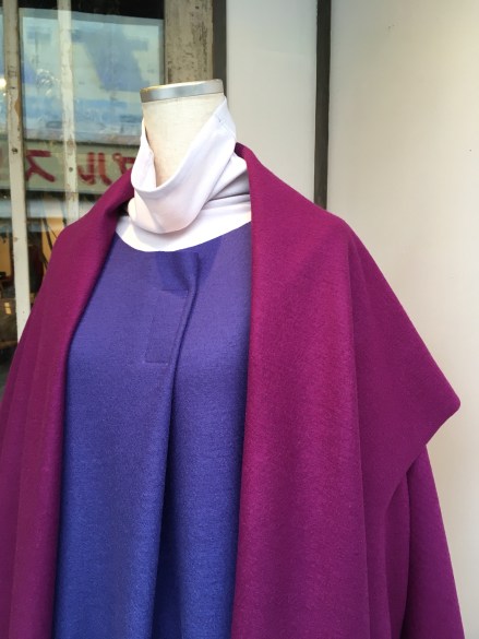 ショート丈のウールコート、パープルとも相性ばっちり!