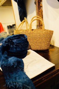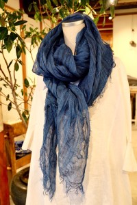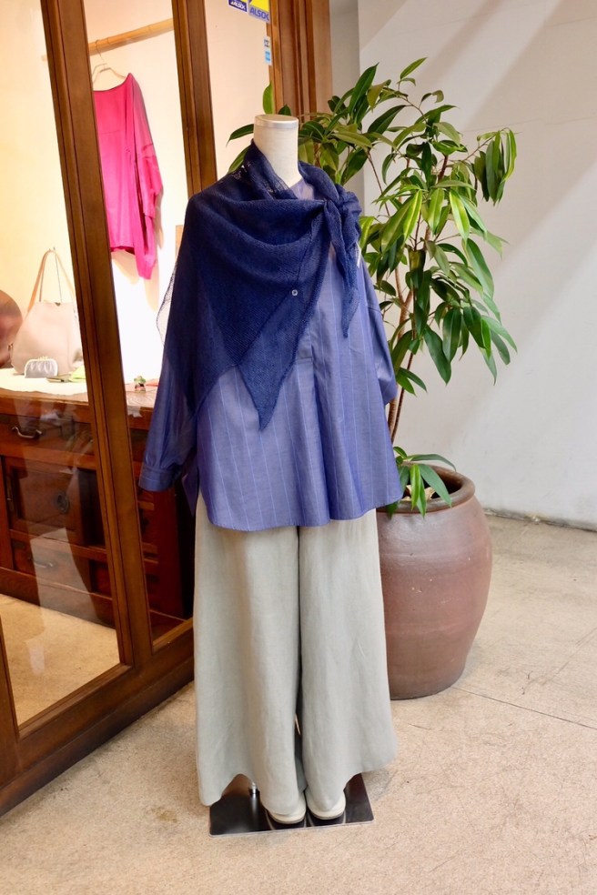 麻の白シャツに大判の藍染ストールを巻いて‼︎