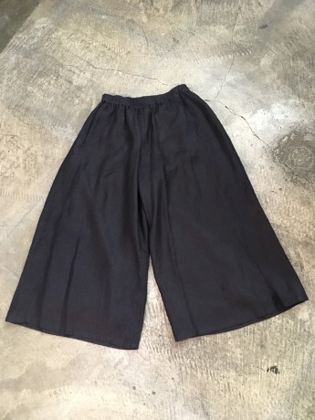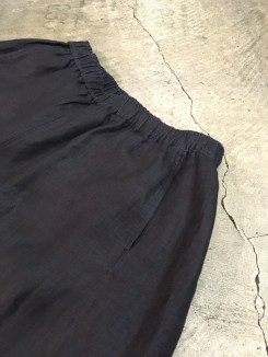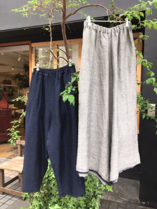 裾に生地の耳がアクセントになって、光沢感のあるリネンが心地よいパンツです。