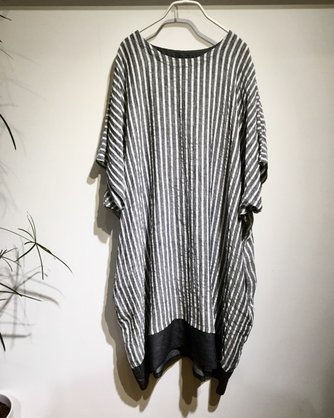 ストライプのリネンで裾の折り返しやビッグポケットも印象的♬