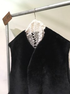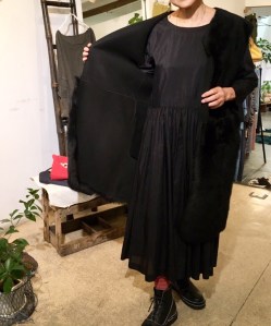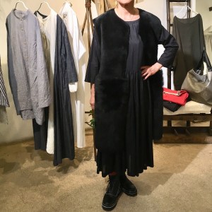 ファーのロングベストとコットンシルクのワンピースの異素材がミックス!