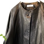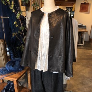 アナディスのラムレザージャケットはノーカラーなので女性らしいシルエット。