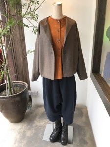 プラス2のパンツと辛子色がアクセントになるメイアファボリのシャツにデニールジャケットを合わせました。こんなカジュアルなコーデからMIYACOさんのブラウスに合わせると綺麗めコーデにつかえます。