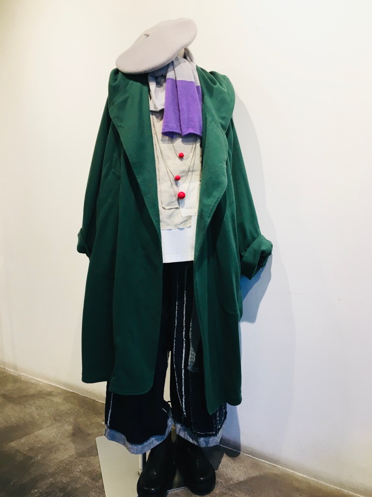 緑のワイドエッグパンツで短いものと合わせて見ました
