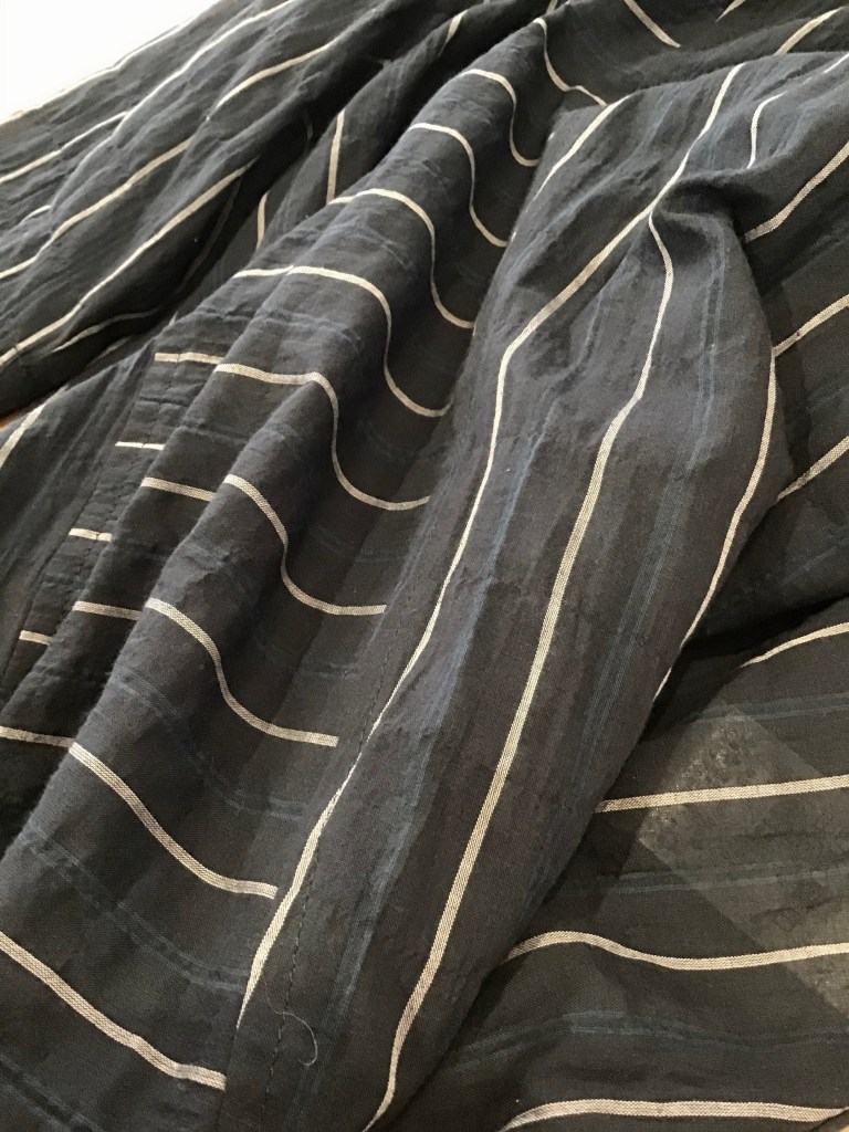 紺地に白と見えづらいですがブルーのラインが入っています