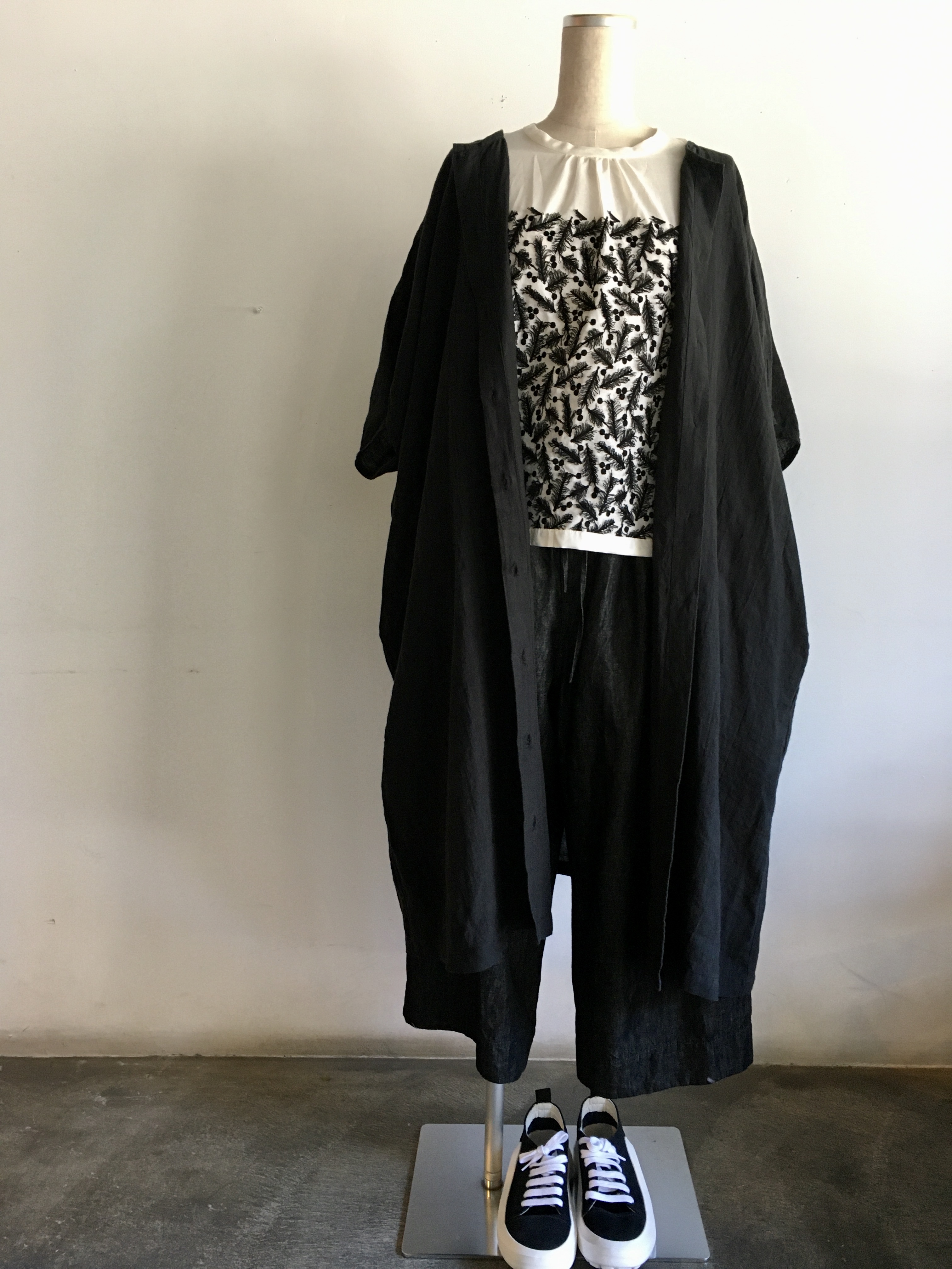 また、黒のパンツをアンクルパンツ のように履けば、素足部分(くるぶし)が出ることで服全体が重くならず、足元の靴の印象が明るくなりますよ。
