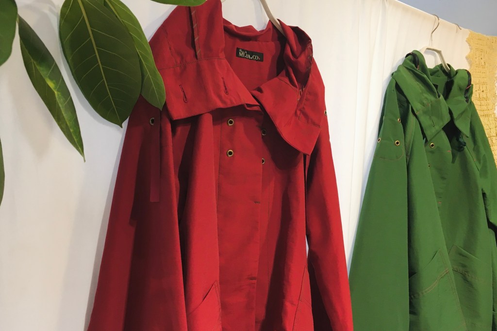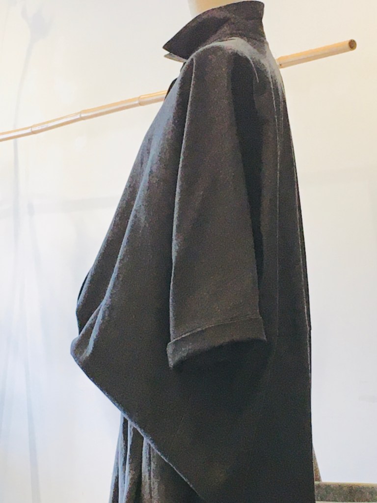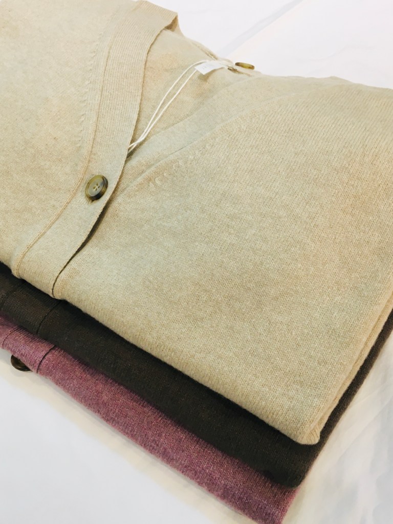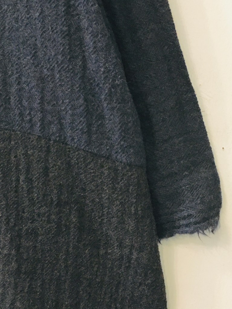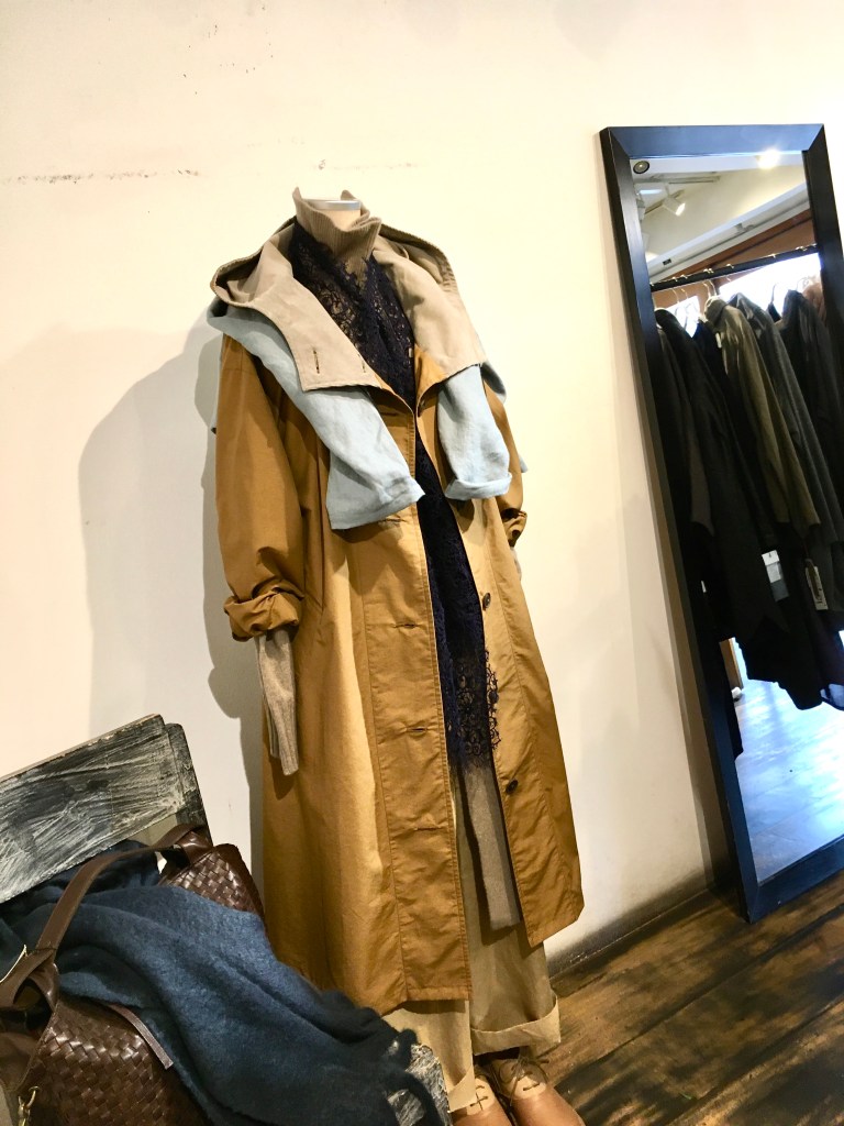 ハリスの長めのニットに前にスリットが入り、ちびかんのコートは、一重で軽い、