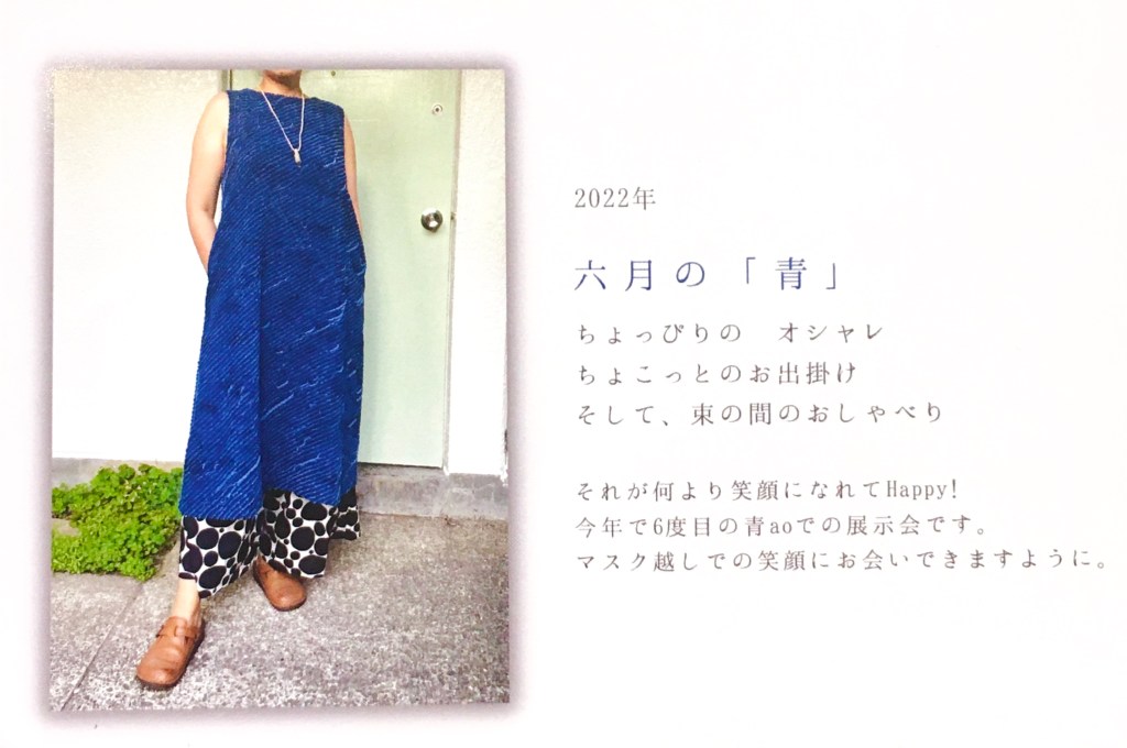 陽 6/3 6月 3, 2022 ~ atelierbyou 高城染工さんの綺麗なラインがおすすめ 着るとえっと思えるゆとりのワンピース パンツと合わせて長めのチュニックのように かっこいい雰囲気も出ます 麻のナチュラル感楽しんで下さい オンライン掲載中 すっきりとしたラインがオススメ デニールプルオーバー オンライン掲載中 コットンなのにサラッとした冷感素材かのような肌当たりのワンピース オンライン掲載中 青ではみどりさん展 素敵なお洋服がいっぱい 生地大好きな私はいつもみどりさんの生地の使い方 選び方が楽しくてたまりません ぜひ〜マスク 消毒でお待ちしています!!