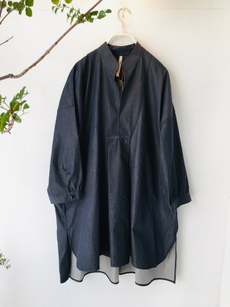 denierのロングのプルオーバー 。お尻まですっぽり隠れておしゃれな雰囲気。