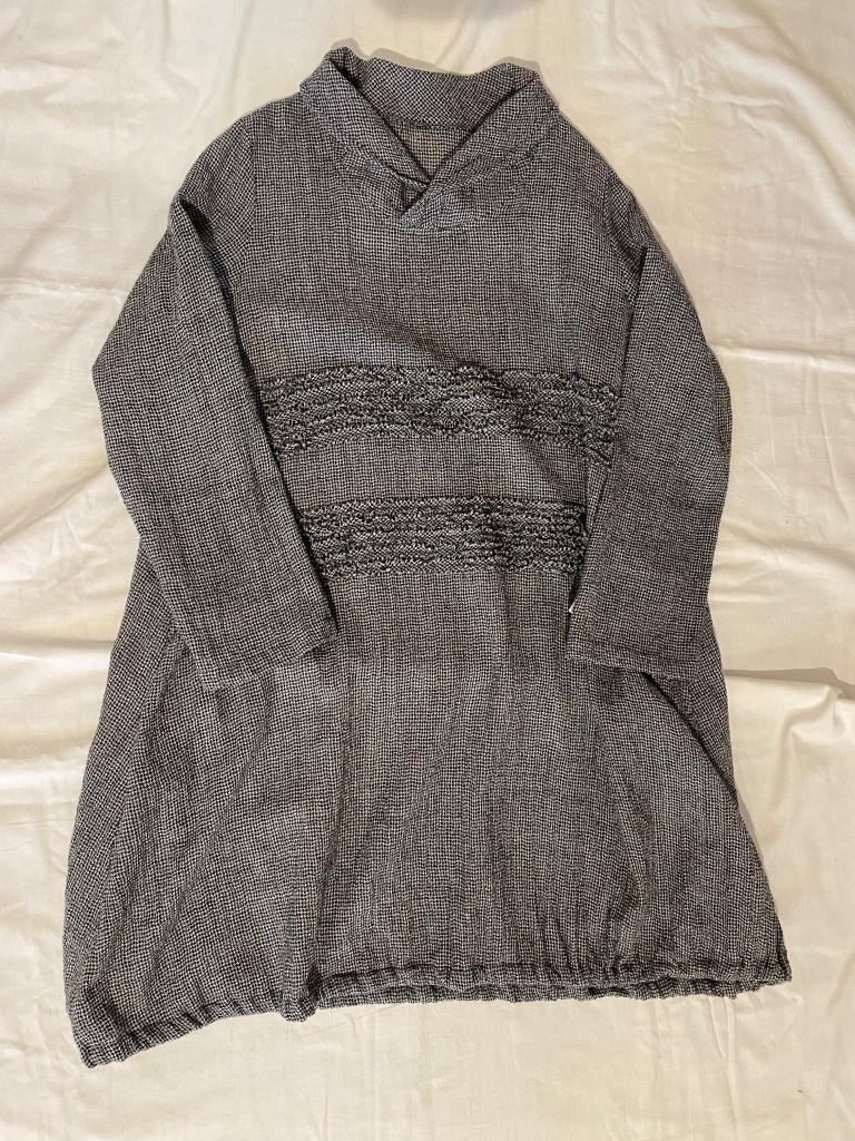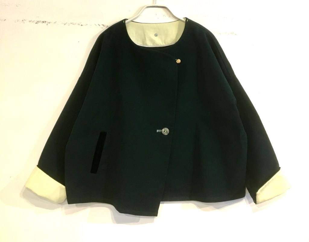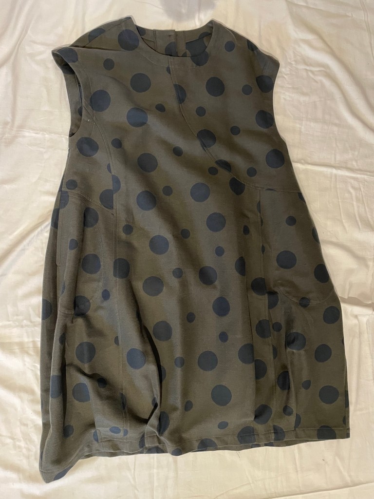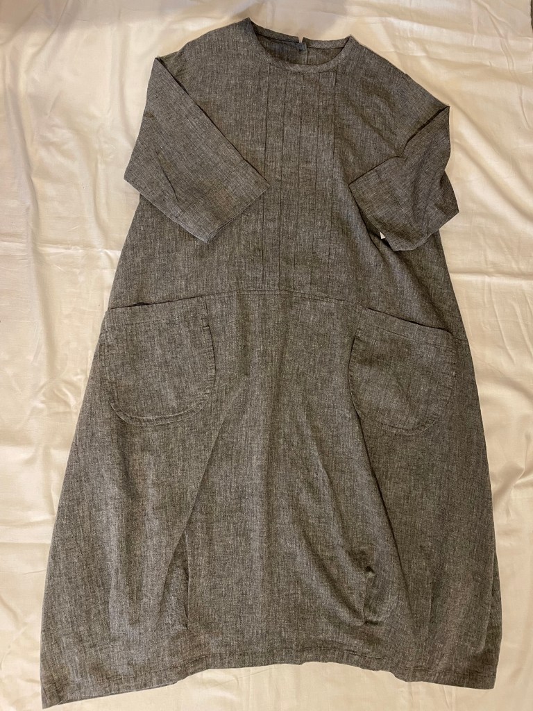クラージュのワンピース。秋物でも生地が薄く、大きなポケットとバルーン型が可愛らしい。