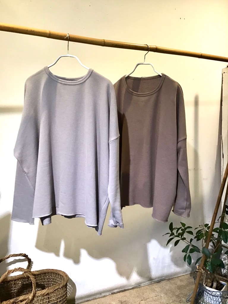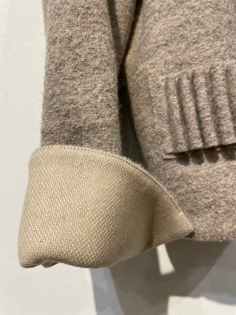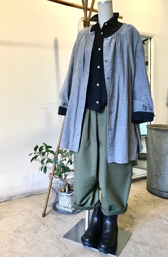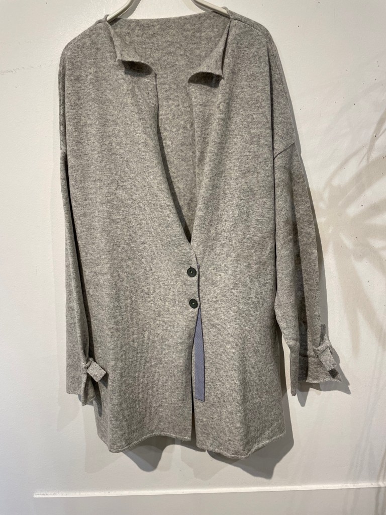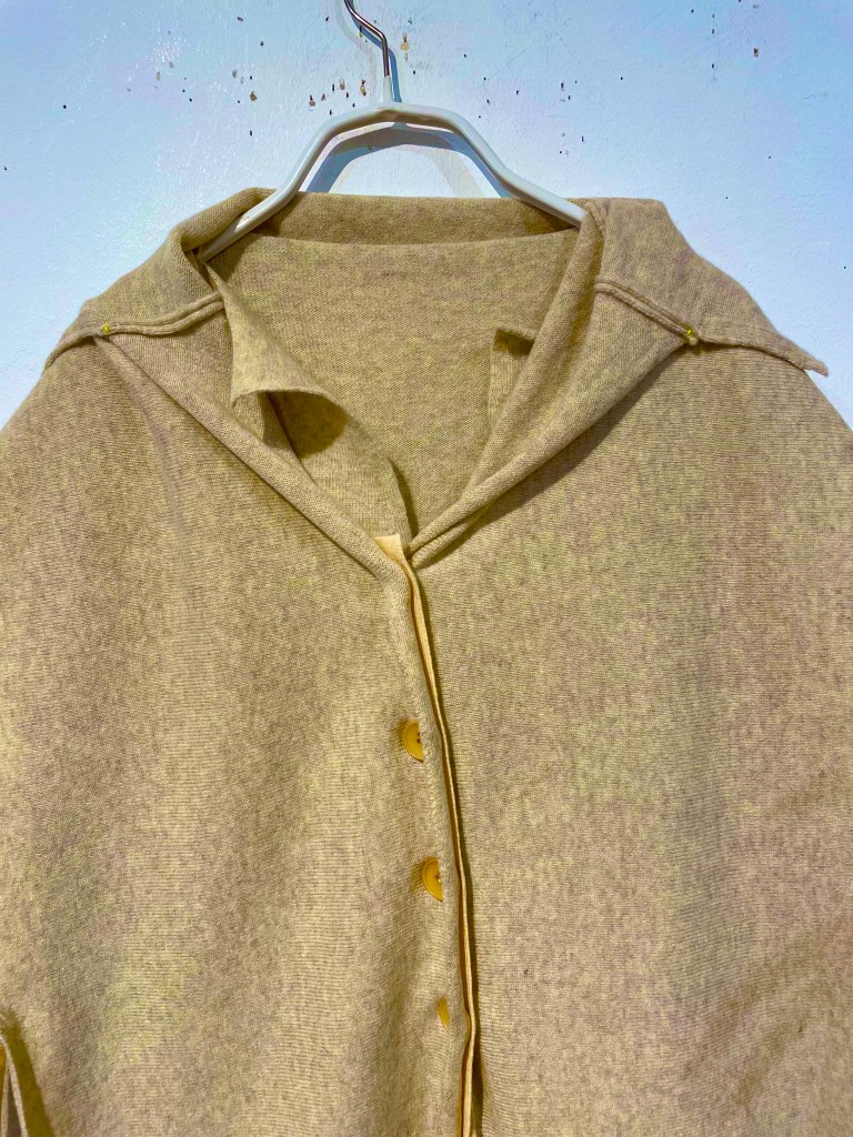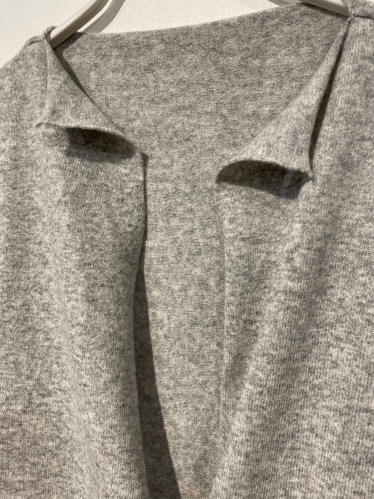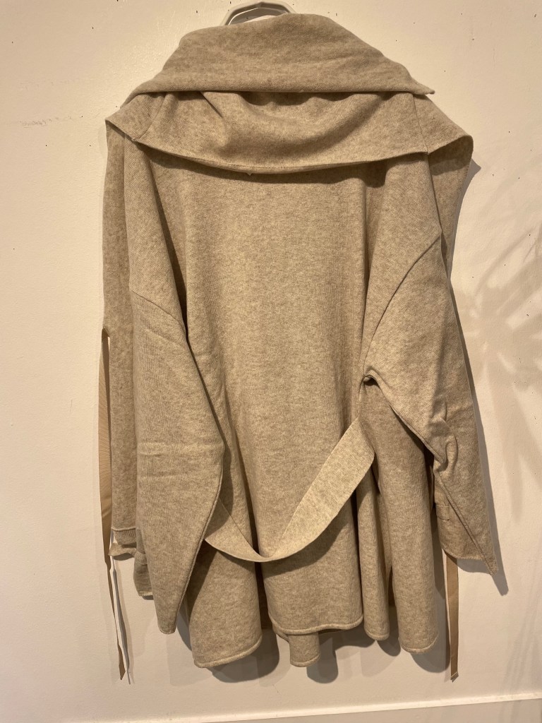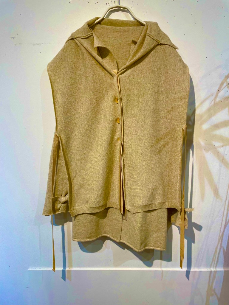 生成りのグレージュ、色もで複雑であれば、着方も複雑。カーディガンとショールを合わせて着るタイプ。