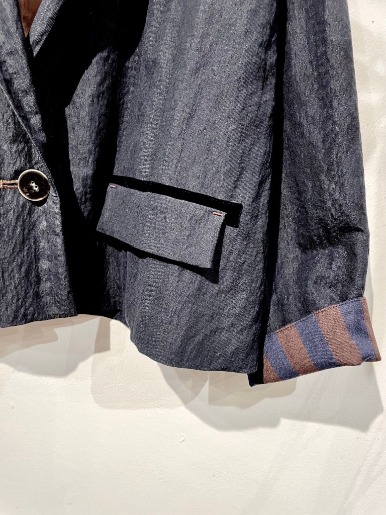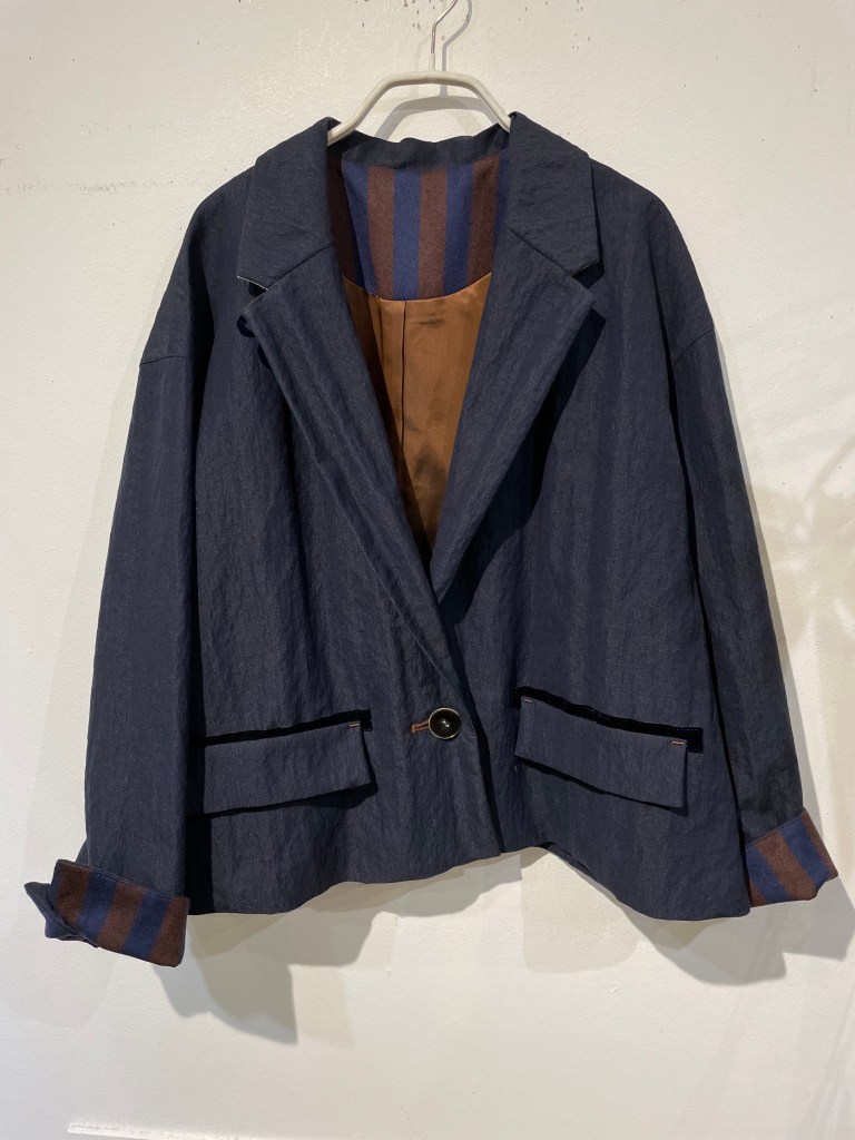 ¥74800 ネイビーのジャケット。写真より濃いです。袖元と襟が可愛いです。
