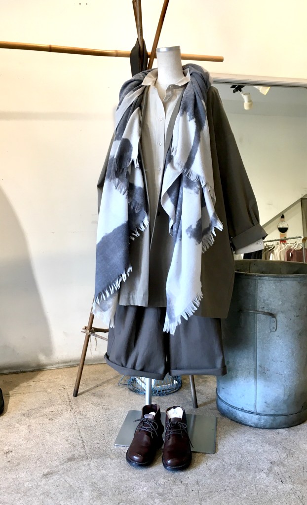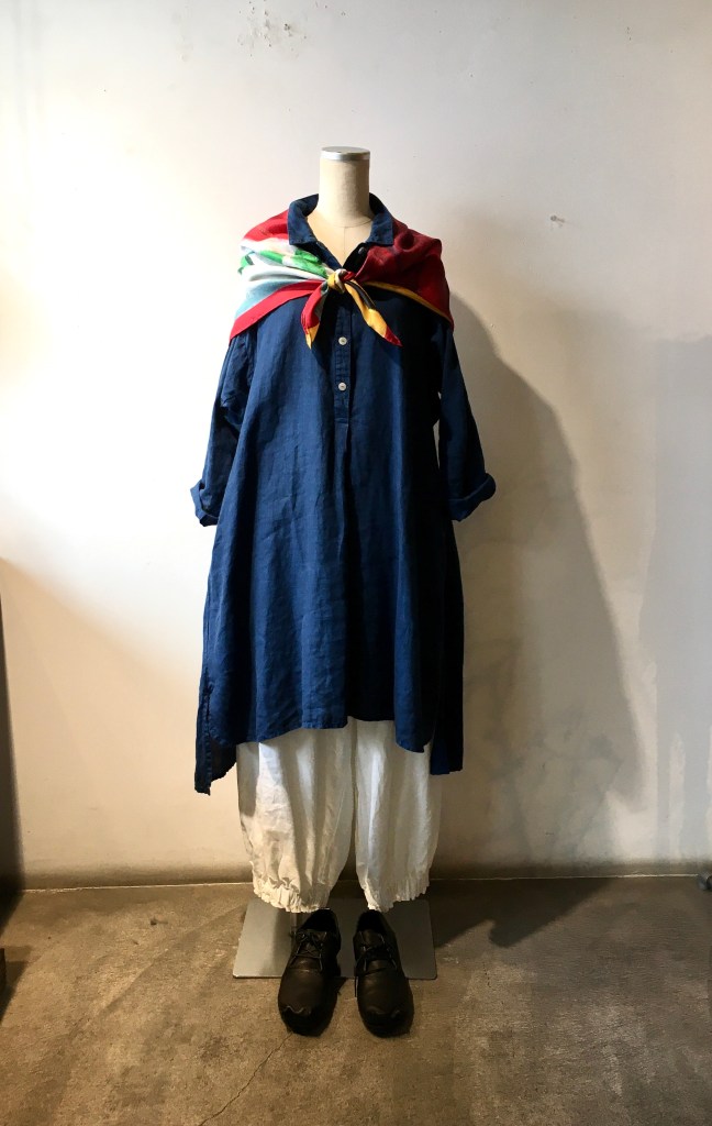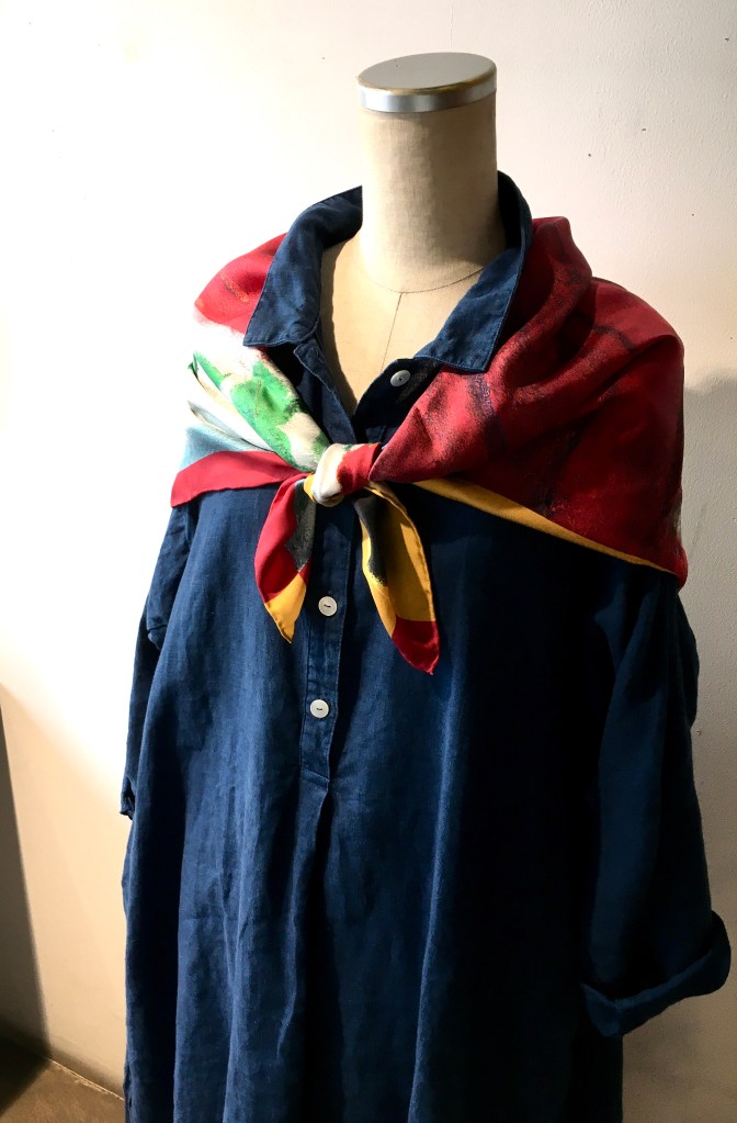 藍染と柄物のスカーフの組み合わせも素敵ですよね!
