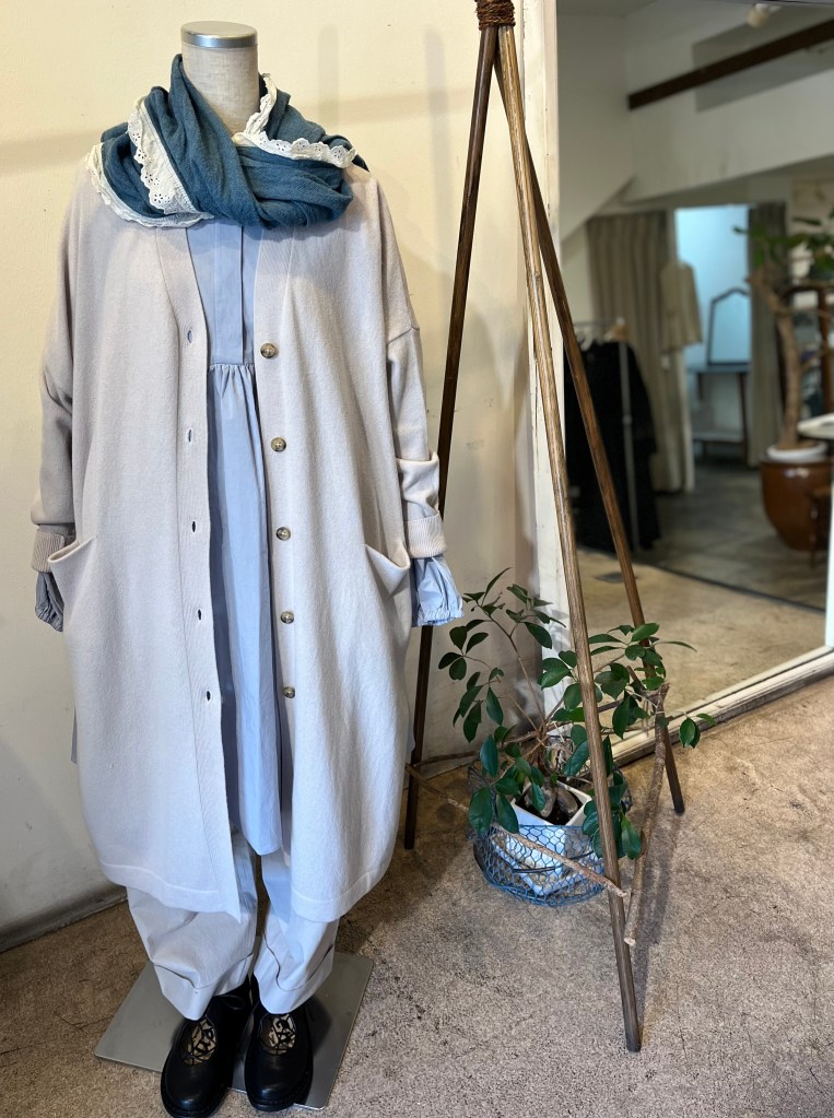カーディガンは再入荷ですので、大バーゲンに。コート代りに着ても、