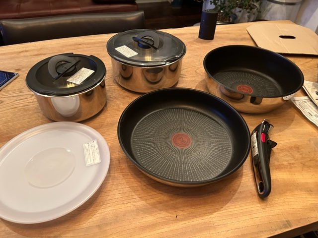 先日友人が来てごはんを食べた時、かたずけてくれた彼が「この鍋いい加減に捨てなさい」で、なるほどそうだね、と思っていたら3日後にはこんなのが送られてきた。なんという事でしょうあのティファールのセットではありませんか!素敵なプレゼントです!!一人暮らしなので、こんなにはいらないけど、これで一生使えそうだ。