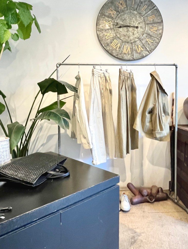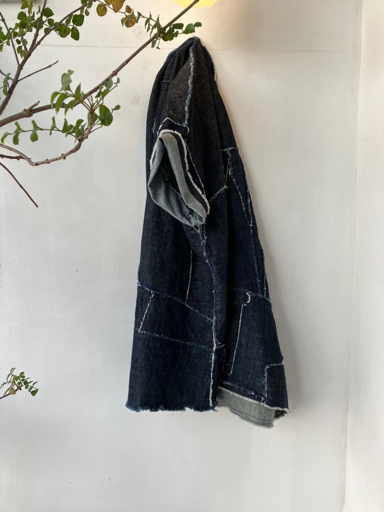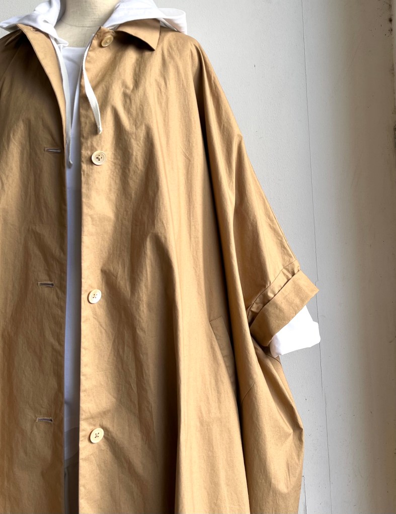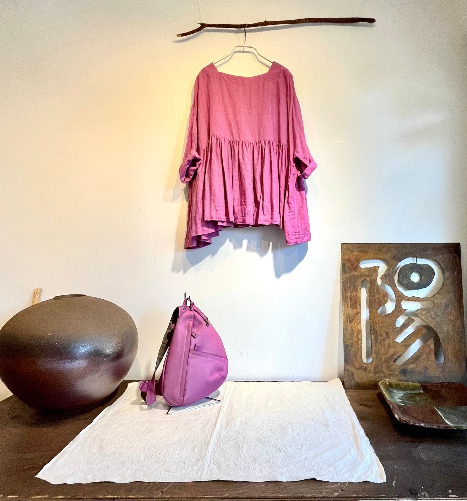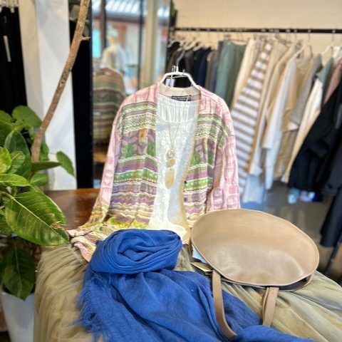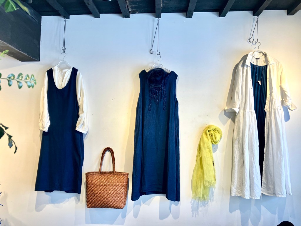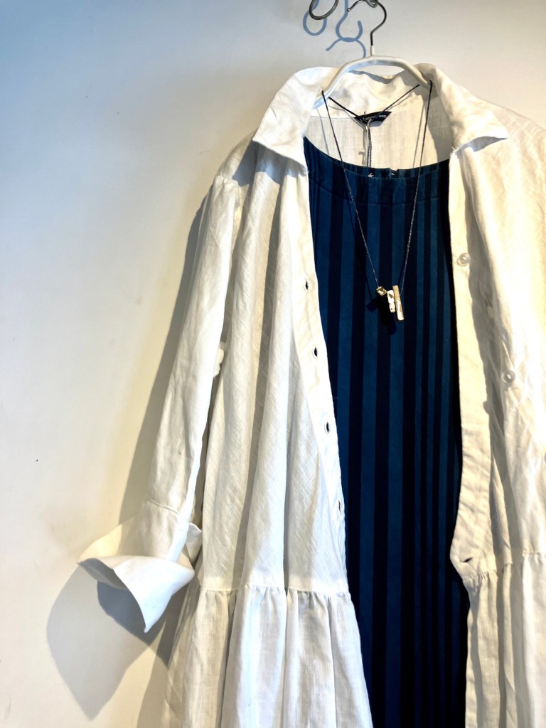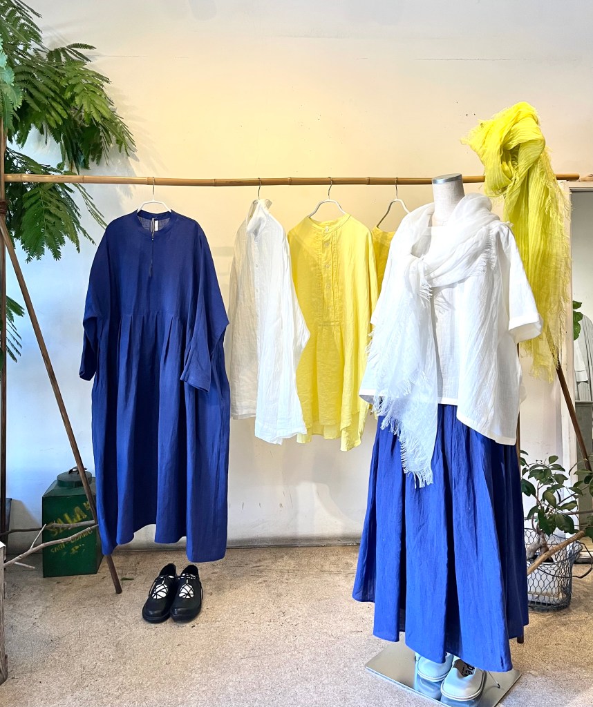 チラッと見えるスカーフも麻の軽い物で今なら色、サイズ揃っています。