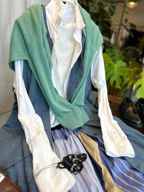 こんなコーディネートは?白シャツにクラージュのロングベスト。インナーで調節を。