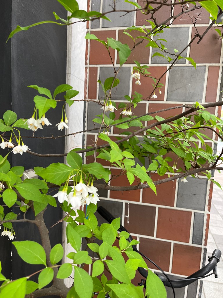 お店の前のエゴノキの可憐な小さな花が咲いています