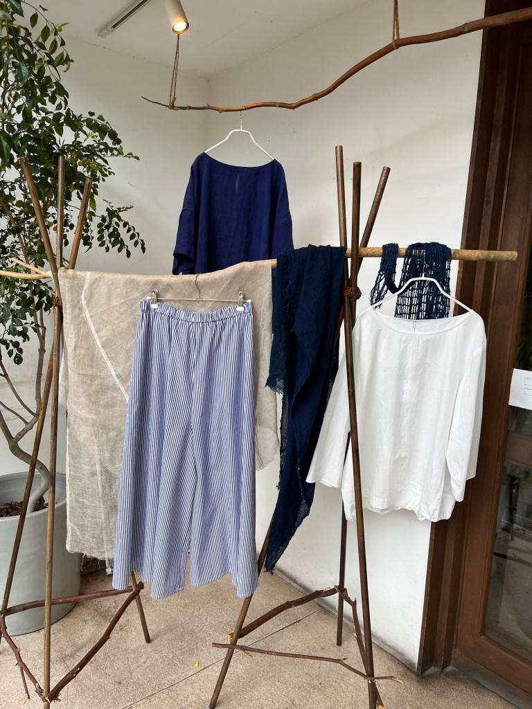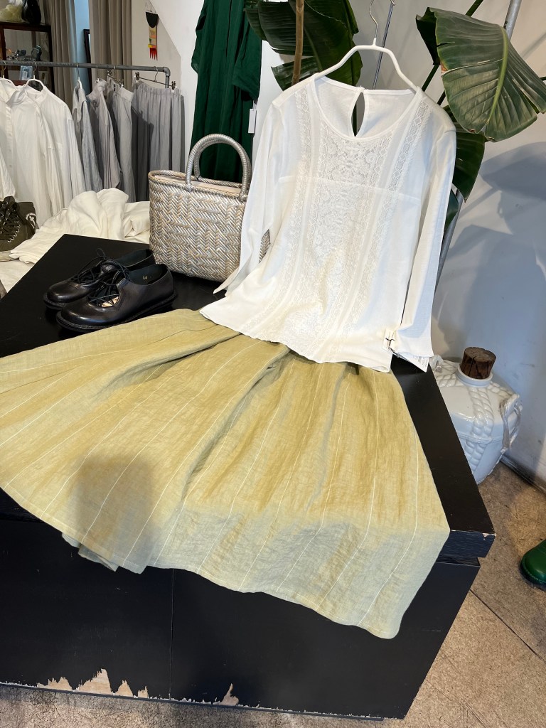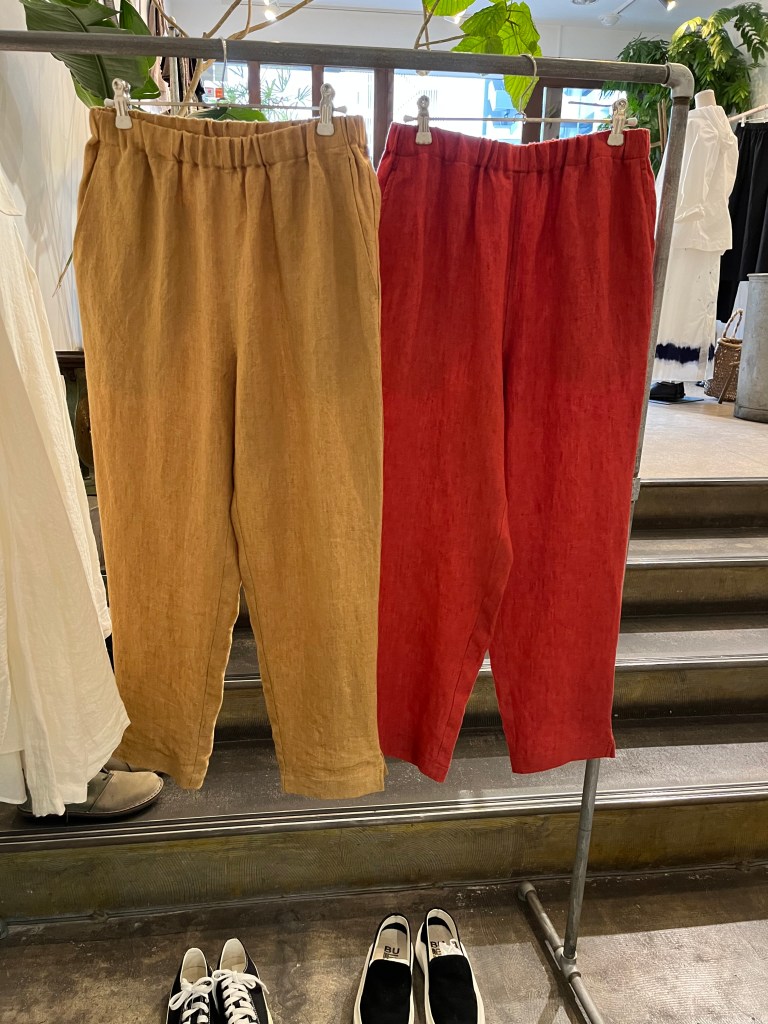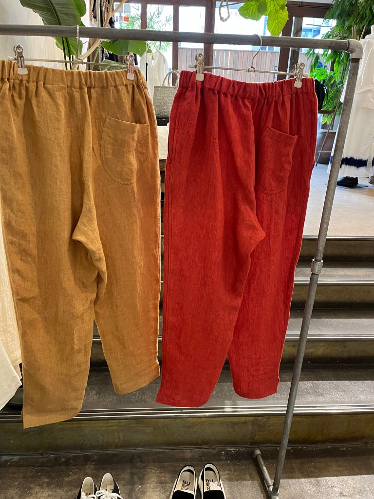 陽 5月 15, 2023 ~ atelierbyou 透け感とレースが綺麗なブラウスと白の細いラインが特徴の麻のスカート デニールのリネン100%のパンツ 丸みのあるポケットが可愛い 25,300円 税込