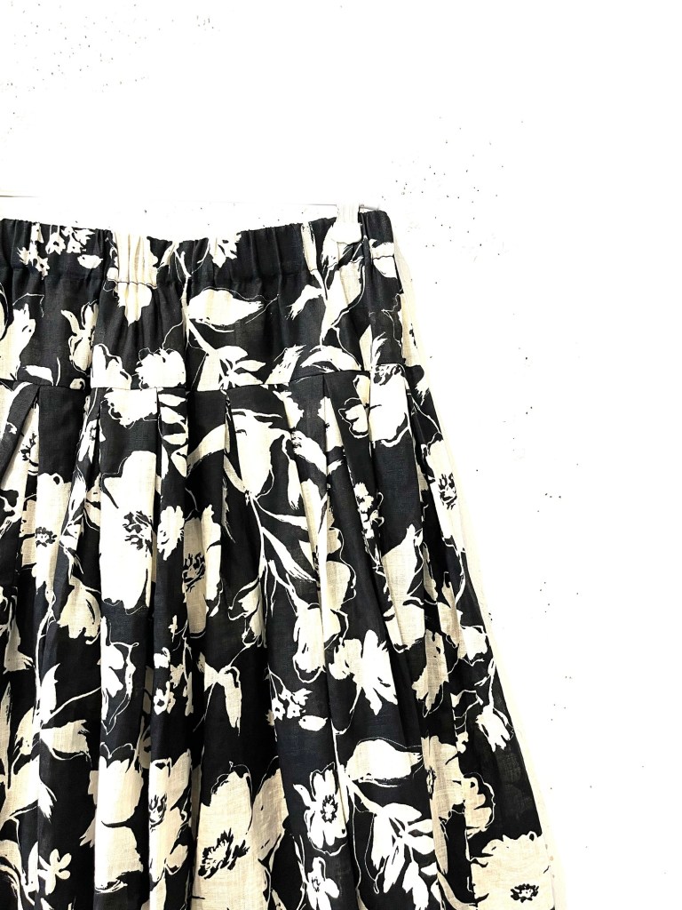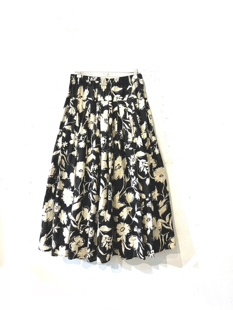 黒地にベージュのプリントスカート。
