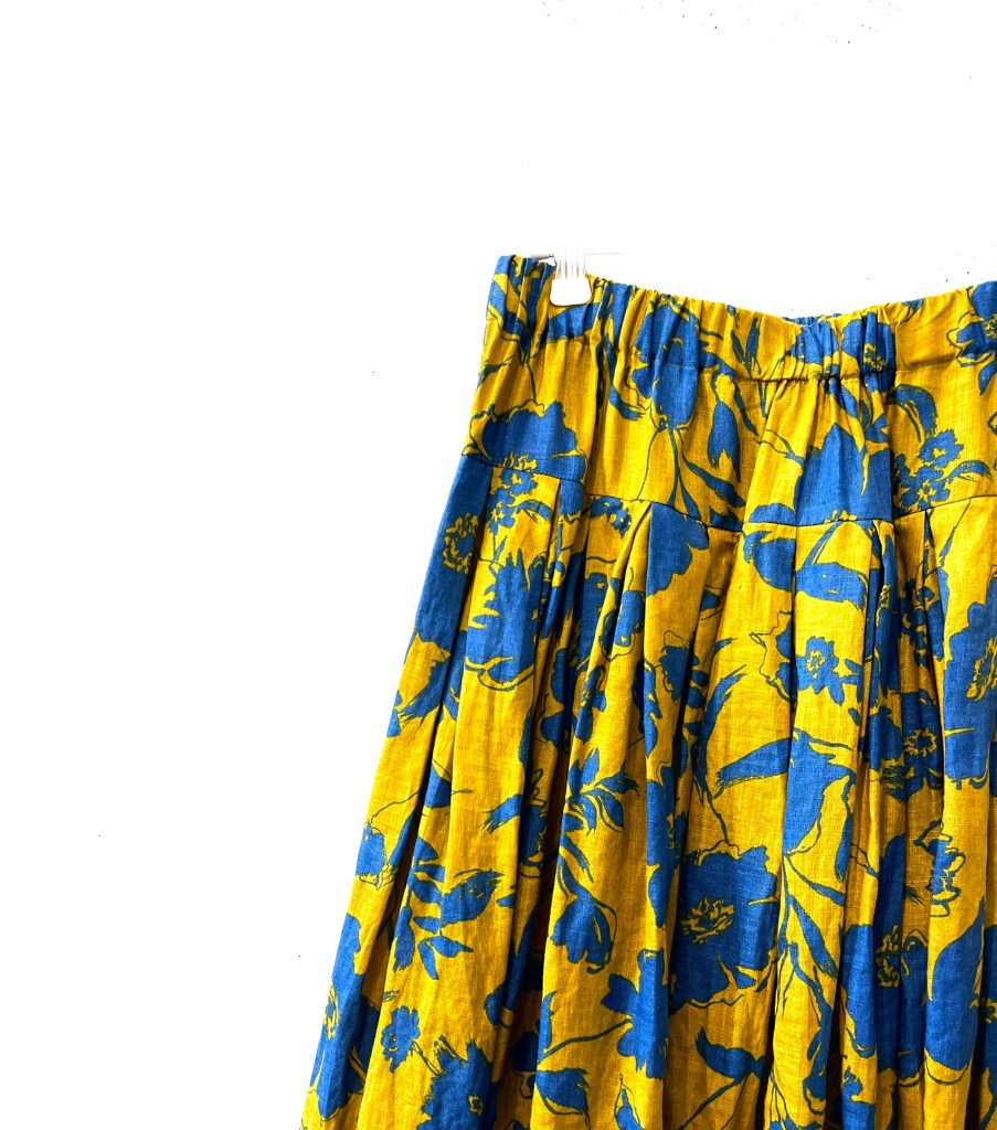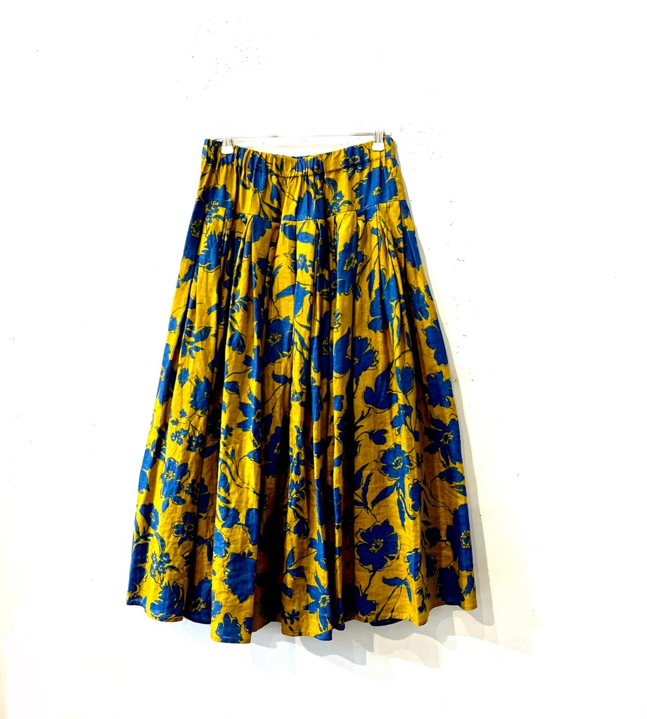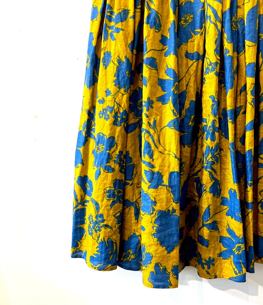 からし地に青色プリントのスカート。