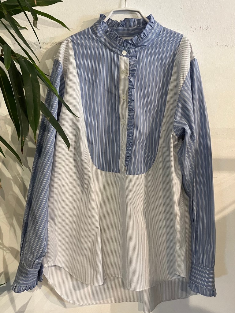 首回りと前立てにフリルがあるのが印象的なストライプのブラウスです
