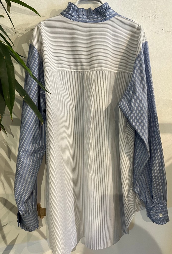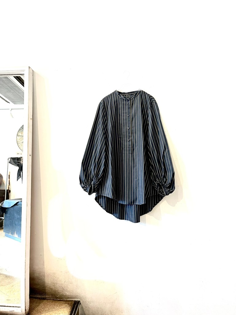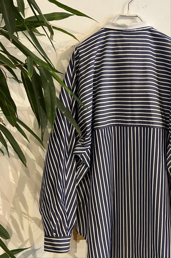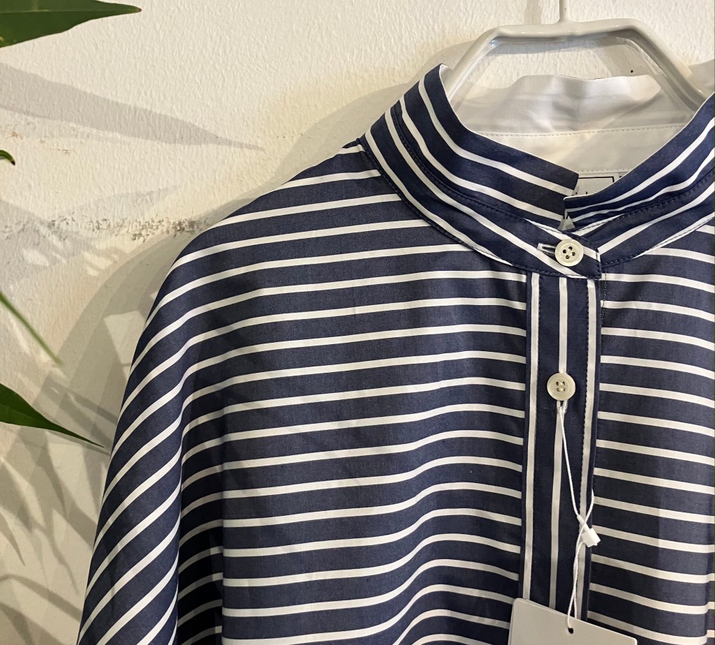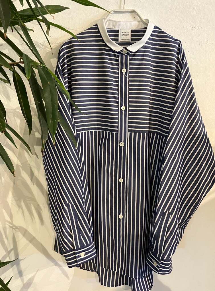 可愛い襟の前開きのシャツ 薄いネイビーと白の縦横のストライプで羽織としても着れます