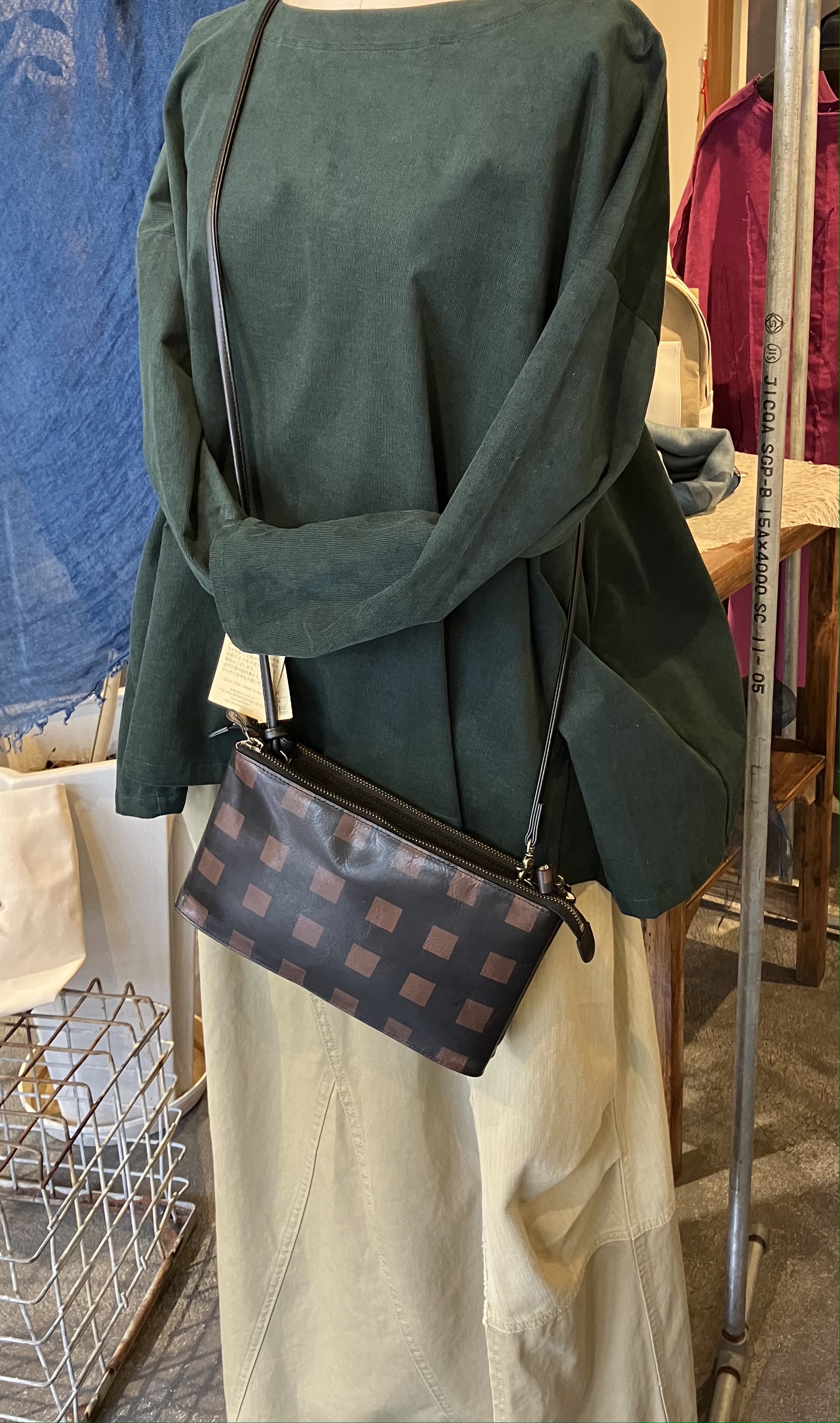 B.stuffの手作業で職人が刷毛で色付けしたチェック柄のショルダーバッグ