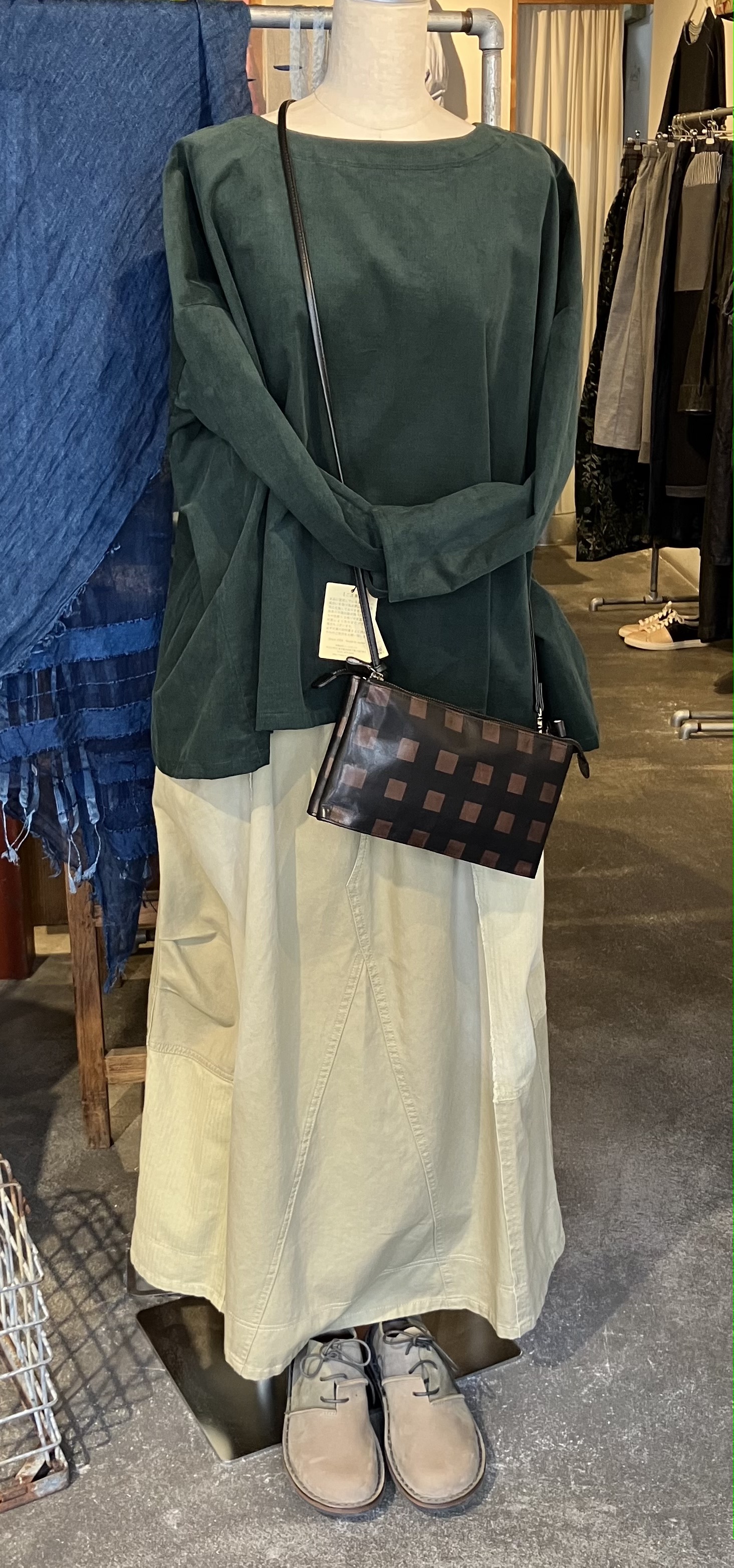 denierのモスグリーンのコーデュロイのトップスとmilimiliの綿100%のベージュのスカート