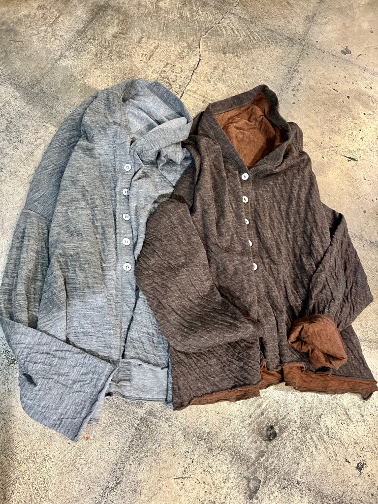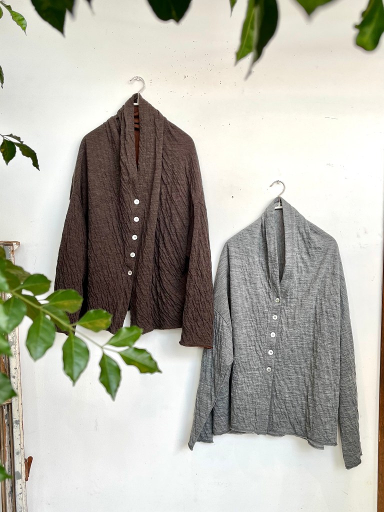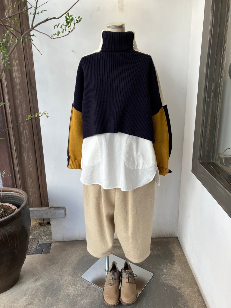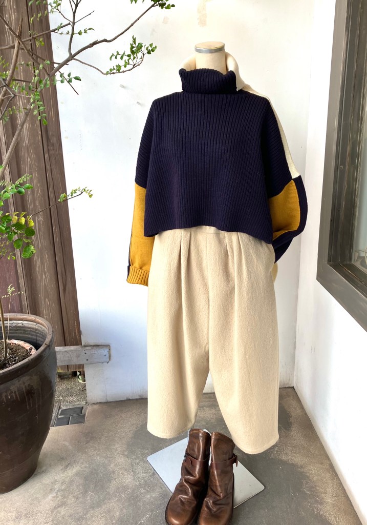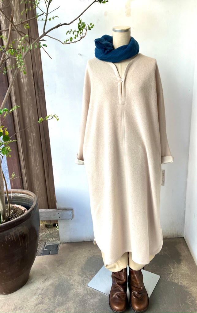 今日の陽 11/14 11月 14, 2023 ~ atelierbyou デニールのウールコットンの柔らかくて温かい、オススメの生地! 手洗いができ、伸びもよく着やすいカーディガンです。 ウール59% コットン41% ¥18,700(税込)