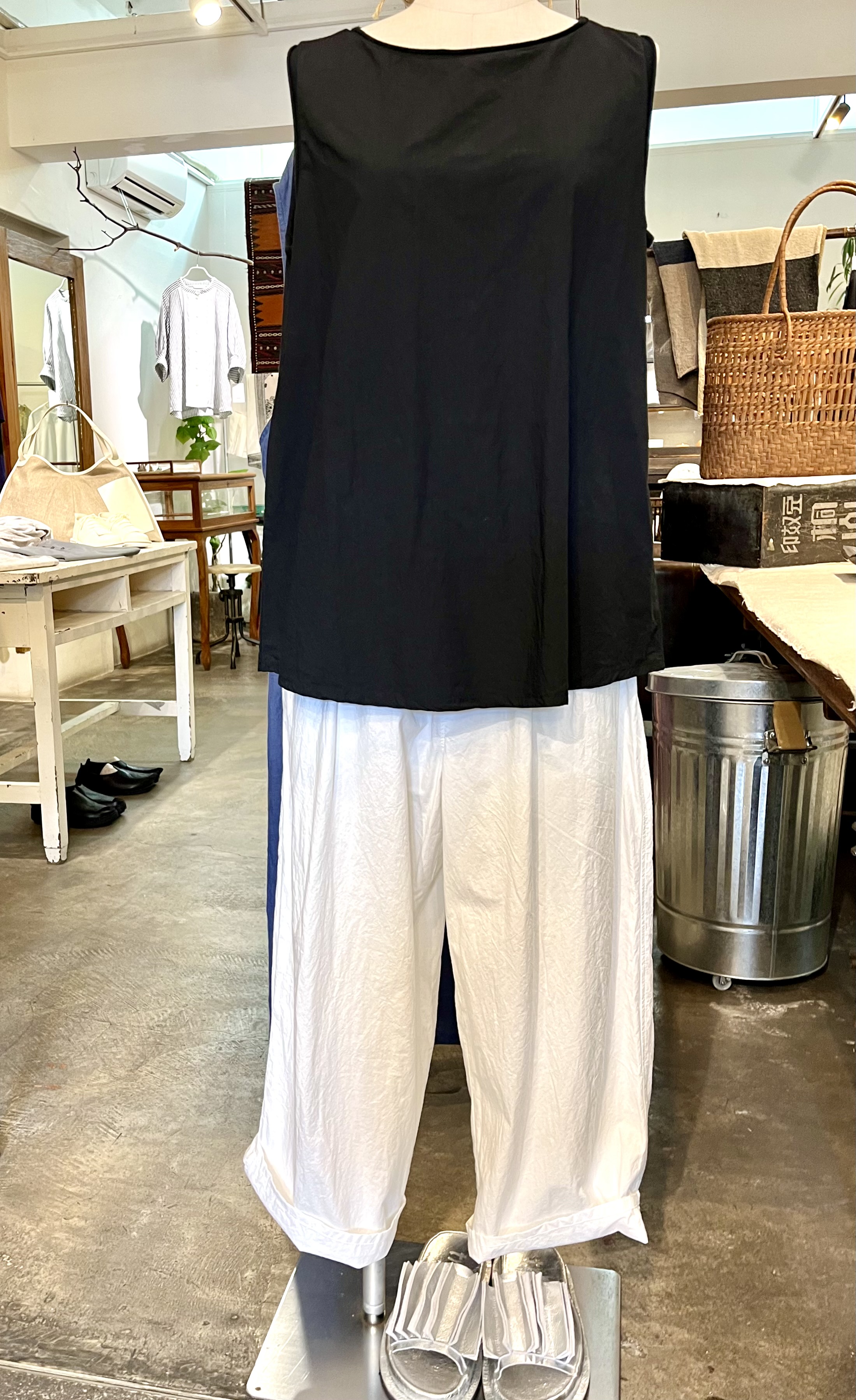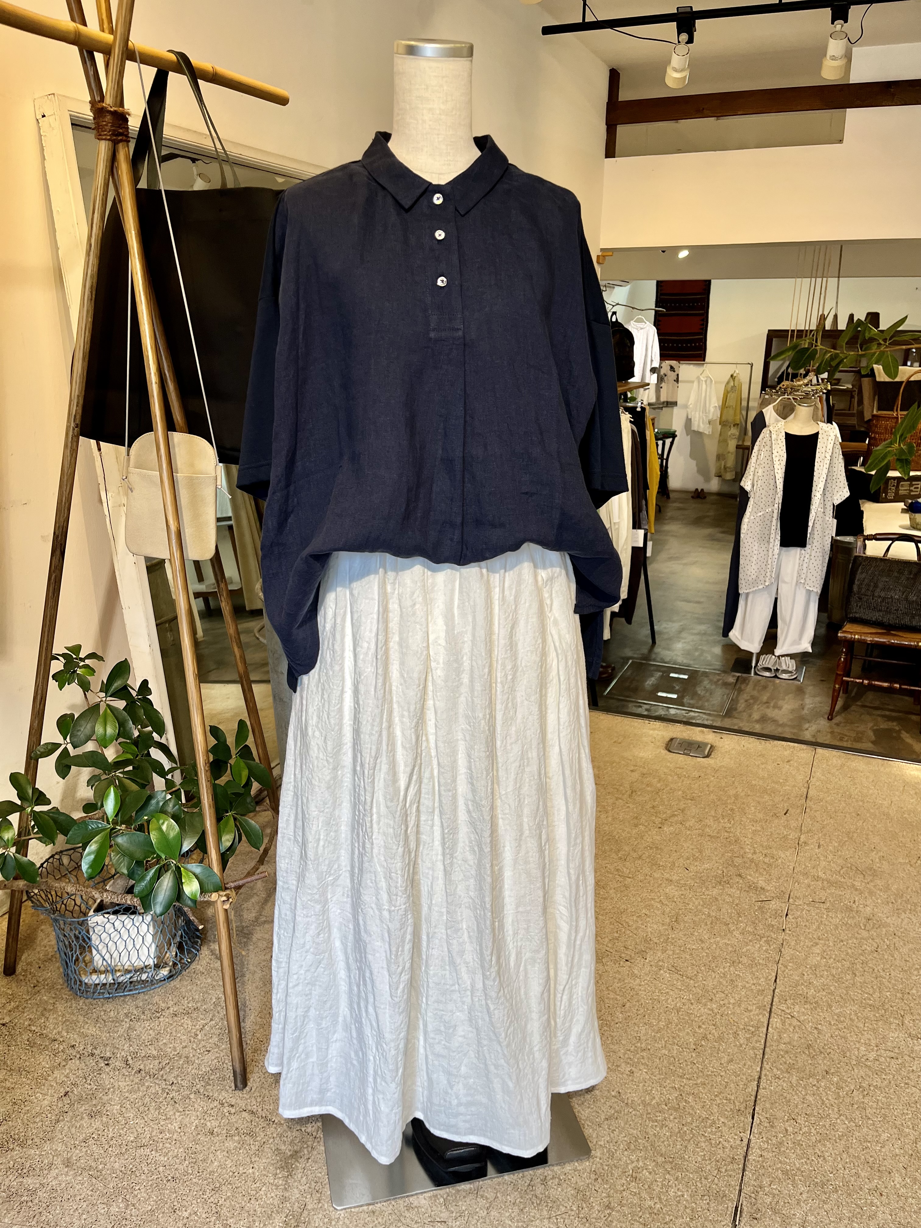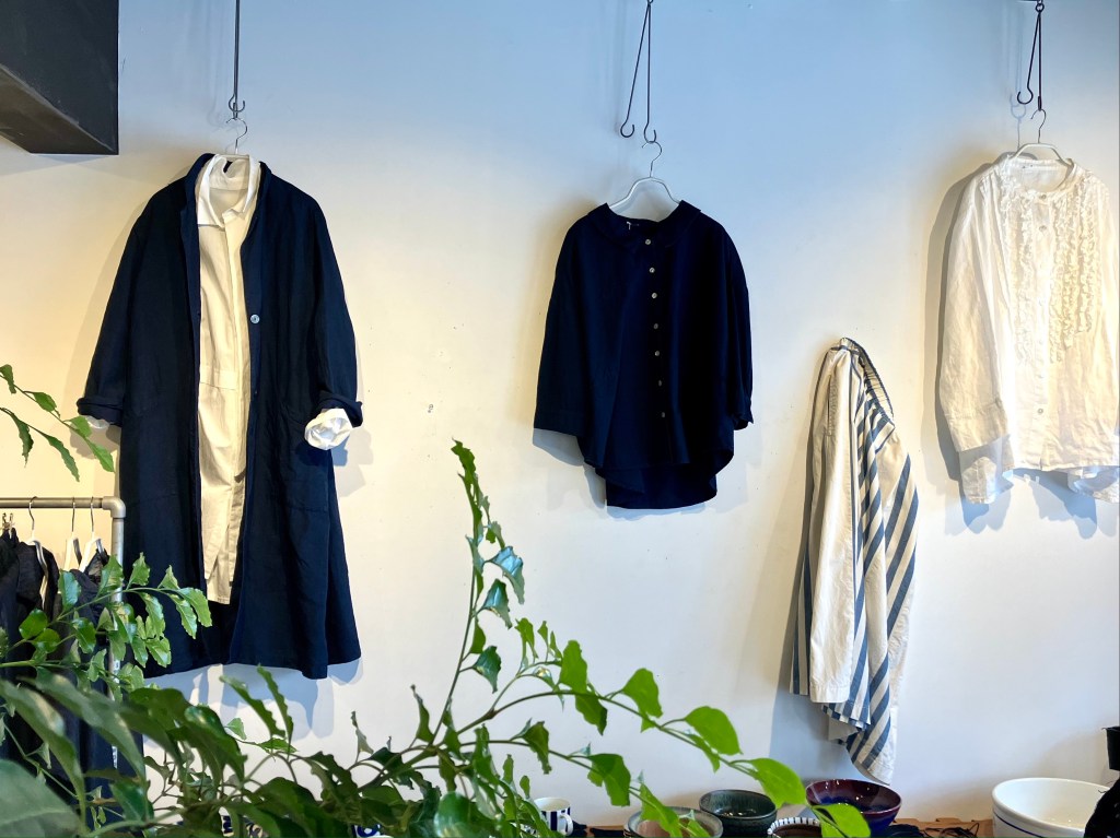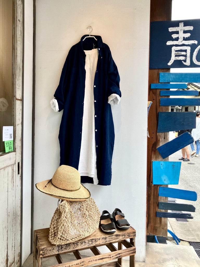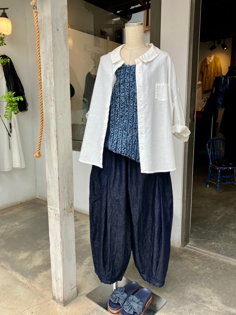 今日の青ao 5/6 5月 6, 2024 ~ atelierbyou 連休も今日で終わり、お天気がどうにかもってます! 高城染工のリネンの白いワンピースに、藍染のスタンダードワンピース、リネン100%で羽織りにも、前を閉めてワンピースでもどちらでもいける、便利な1枚です。 高城染工のデニムフリンジブラウス、デニムスソタックパンツ、白のワイドシャツ