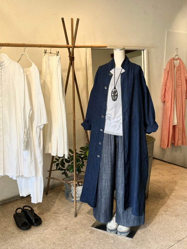 裾にスリットがあるので、ボトムにパンツを合わせてもおしゃれです。