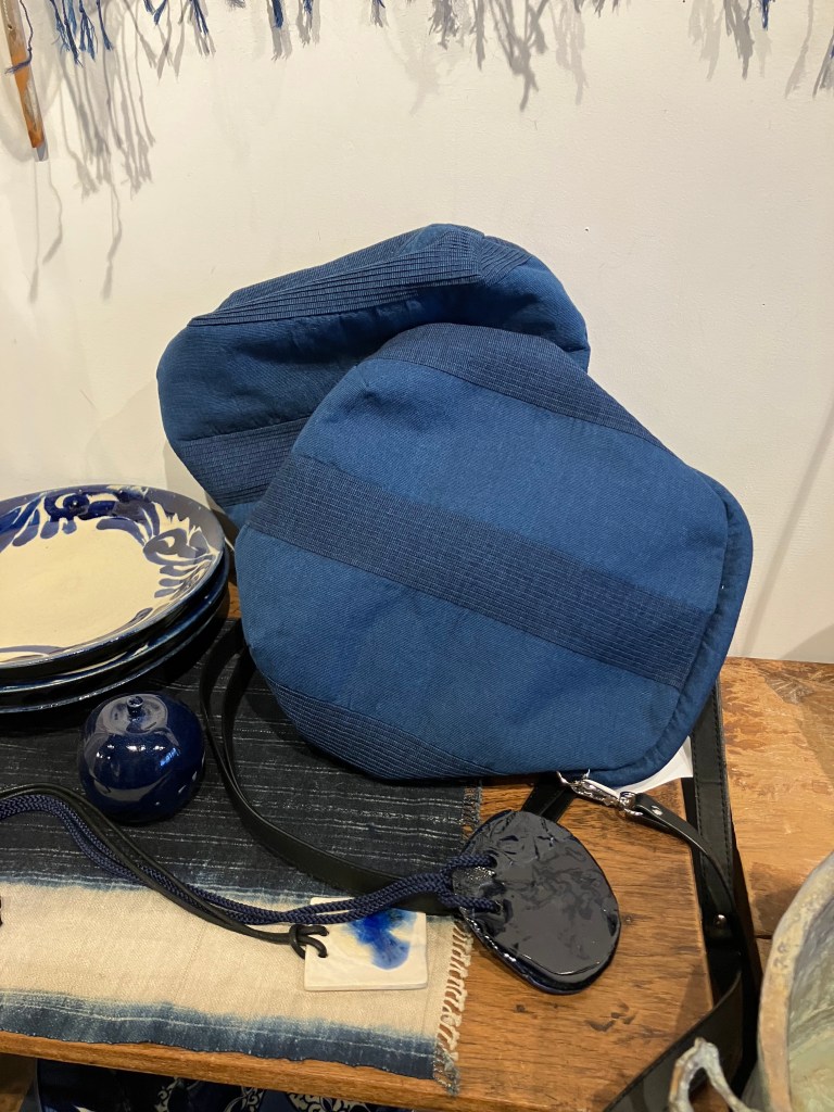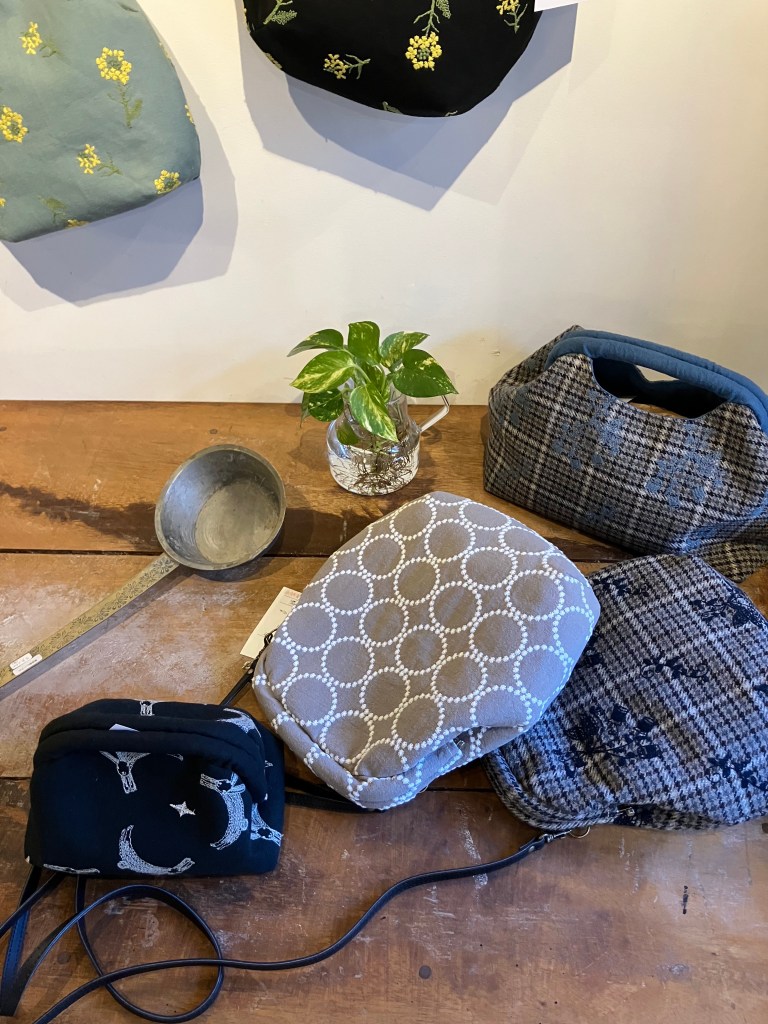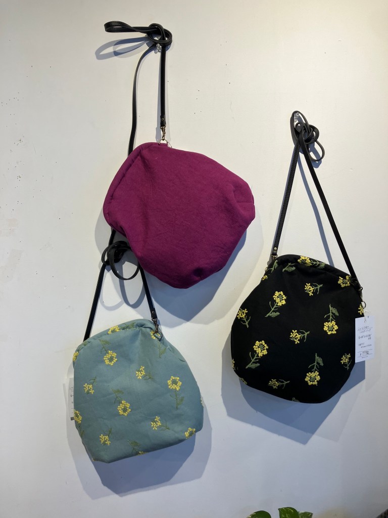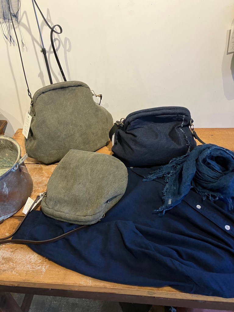 藍染、ベンガラ染、デニム、麻、いろいろな素材が揃ったガマ口バッグ