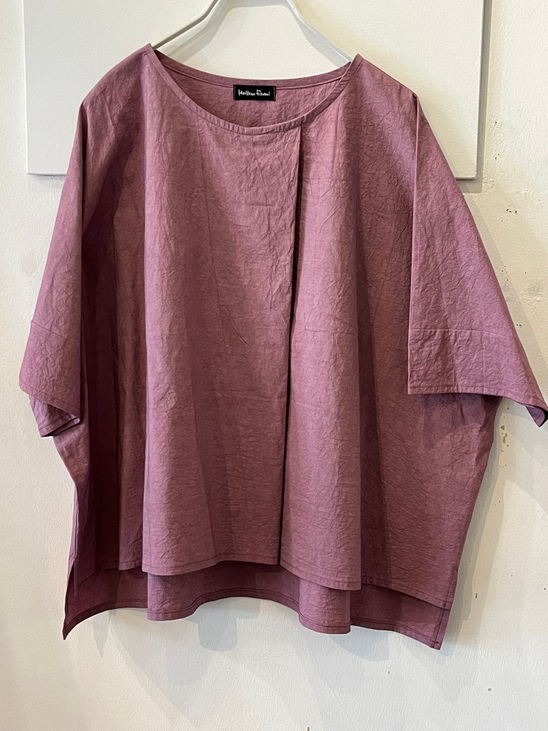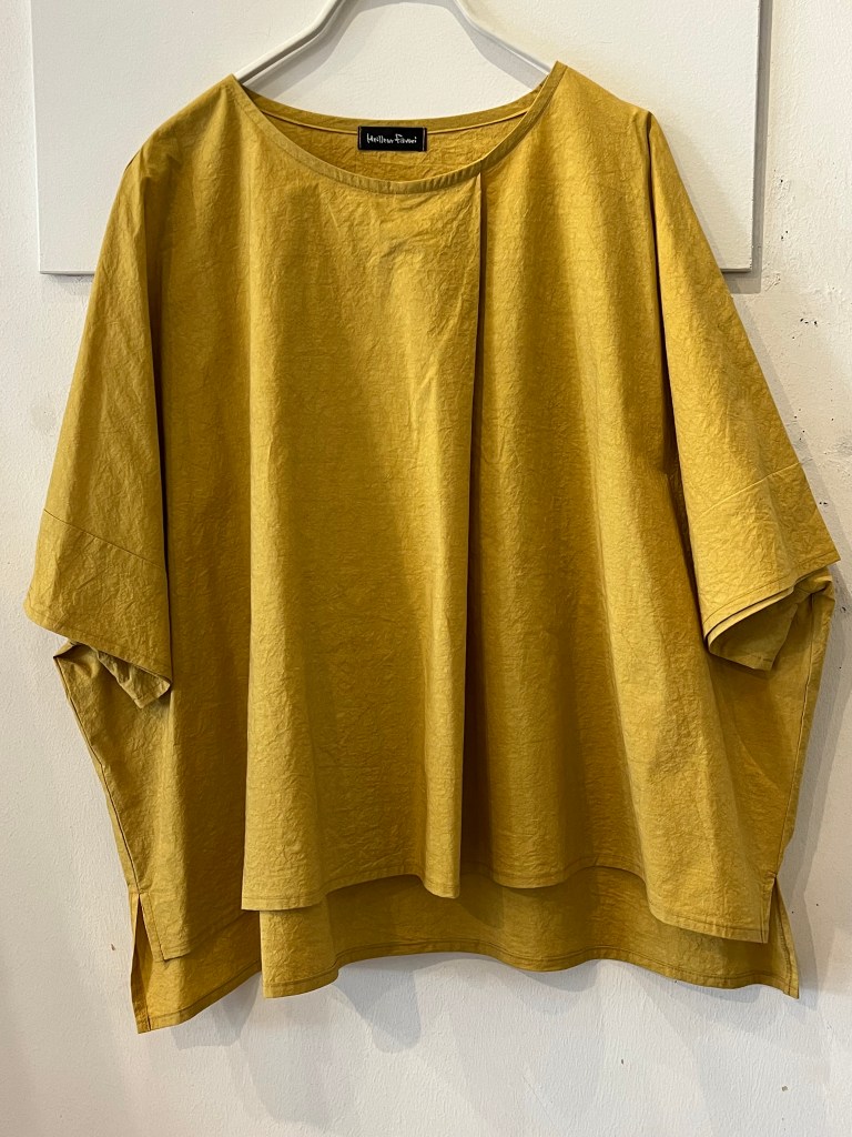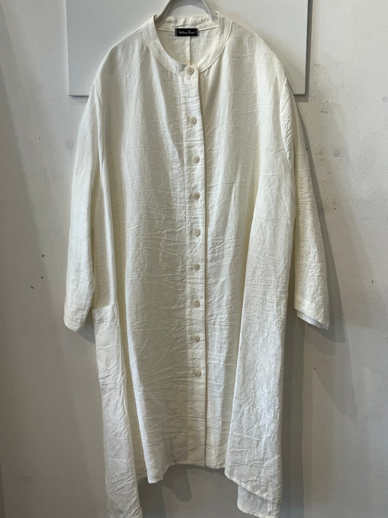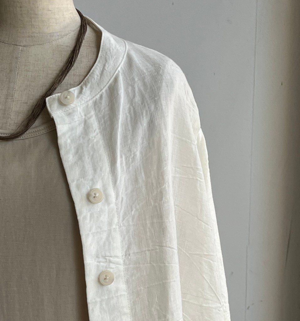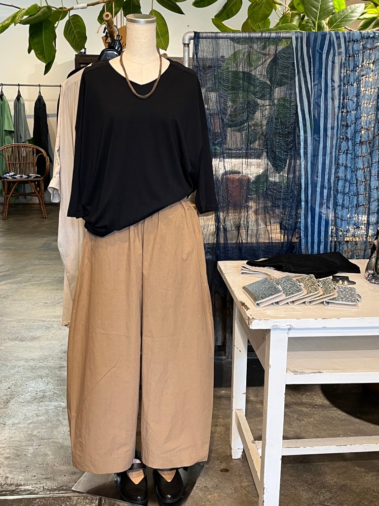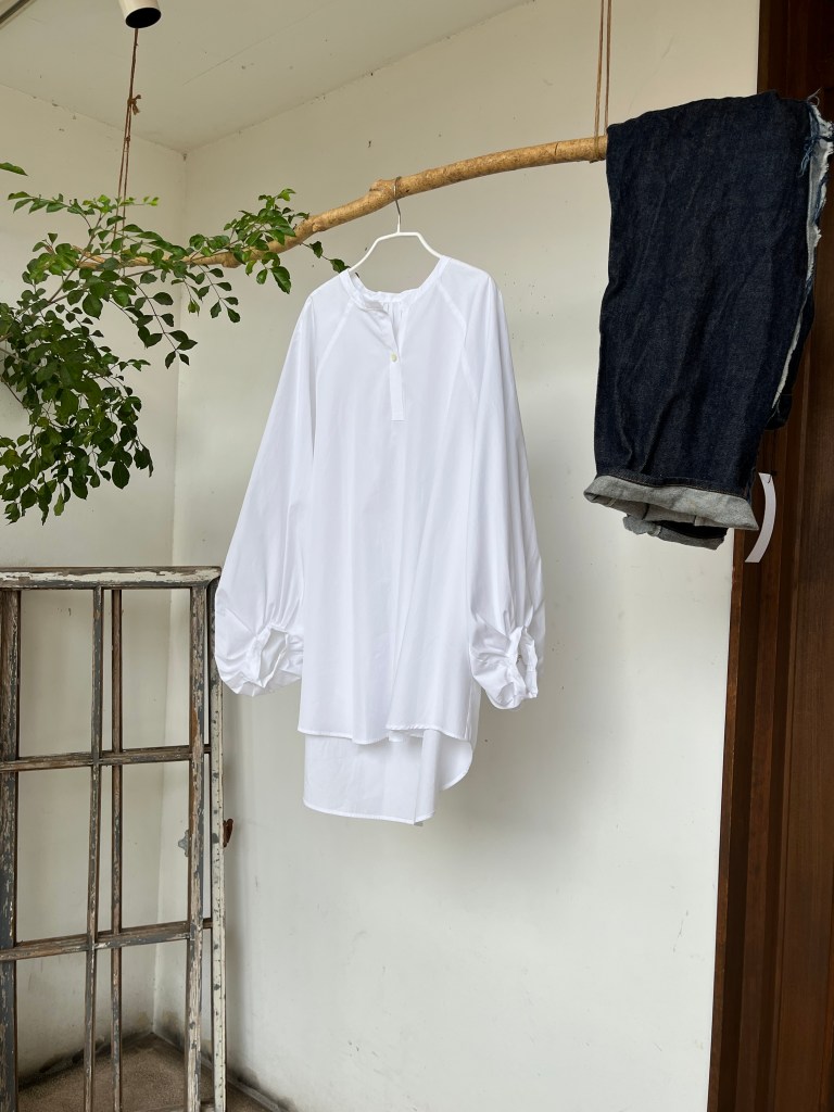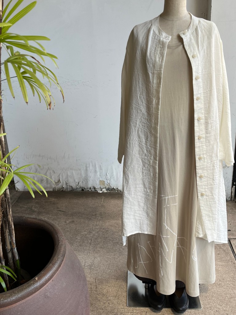 高城染工さんの麻の生成りのパッチワークスカートと白シャツ は藍染もございます。