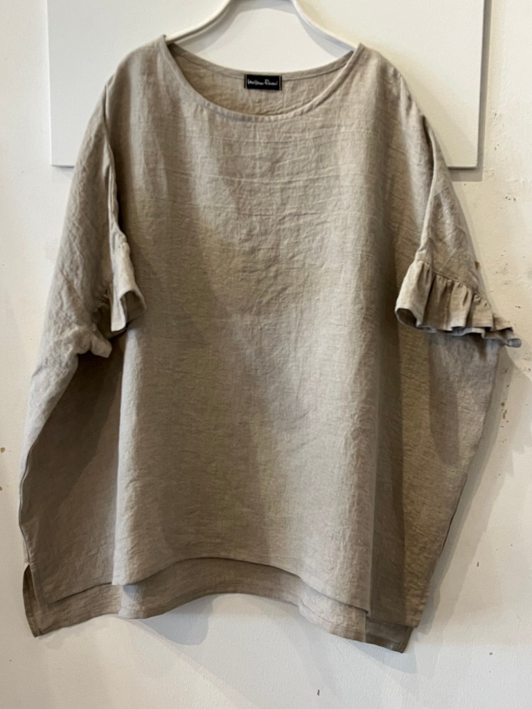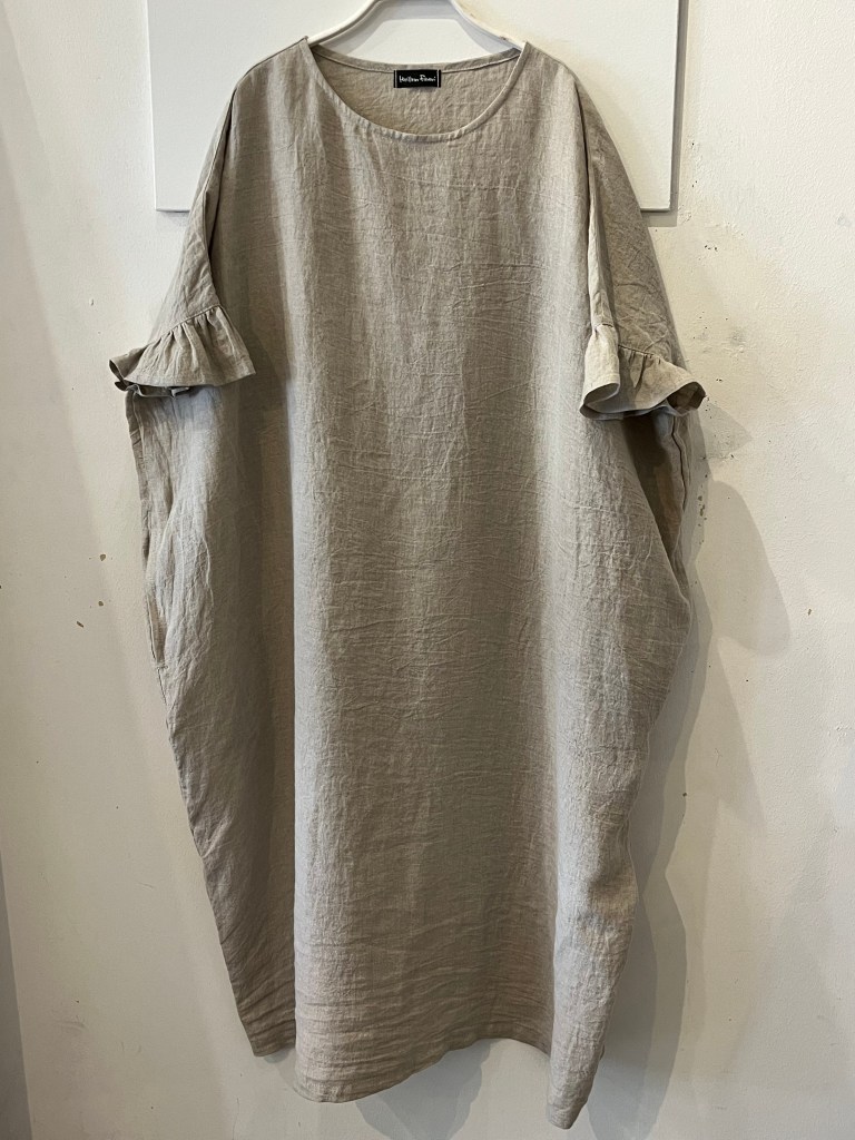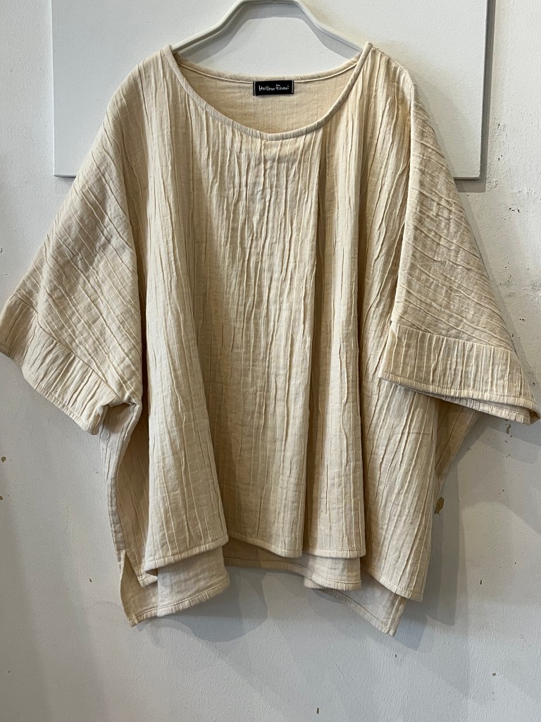 タンクトップに羽織るだけの麻マント、日除けにもなり風も通すので便利でオシャレ。