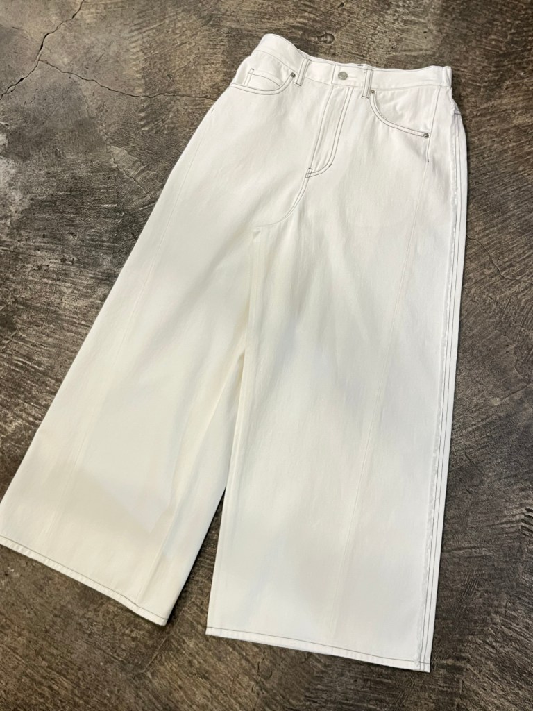 白のワイドパンツもおすすめ ブルーの方は薄手のストレッチ